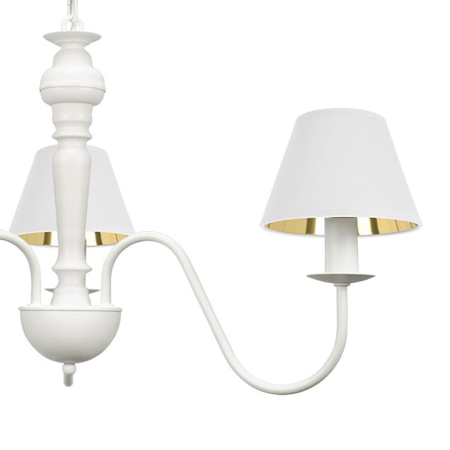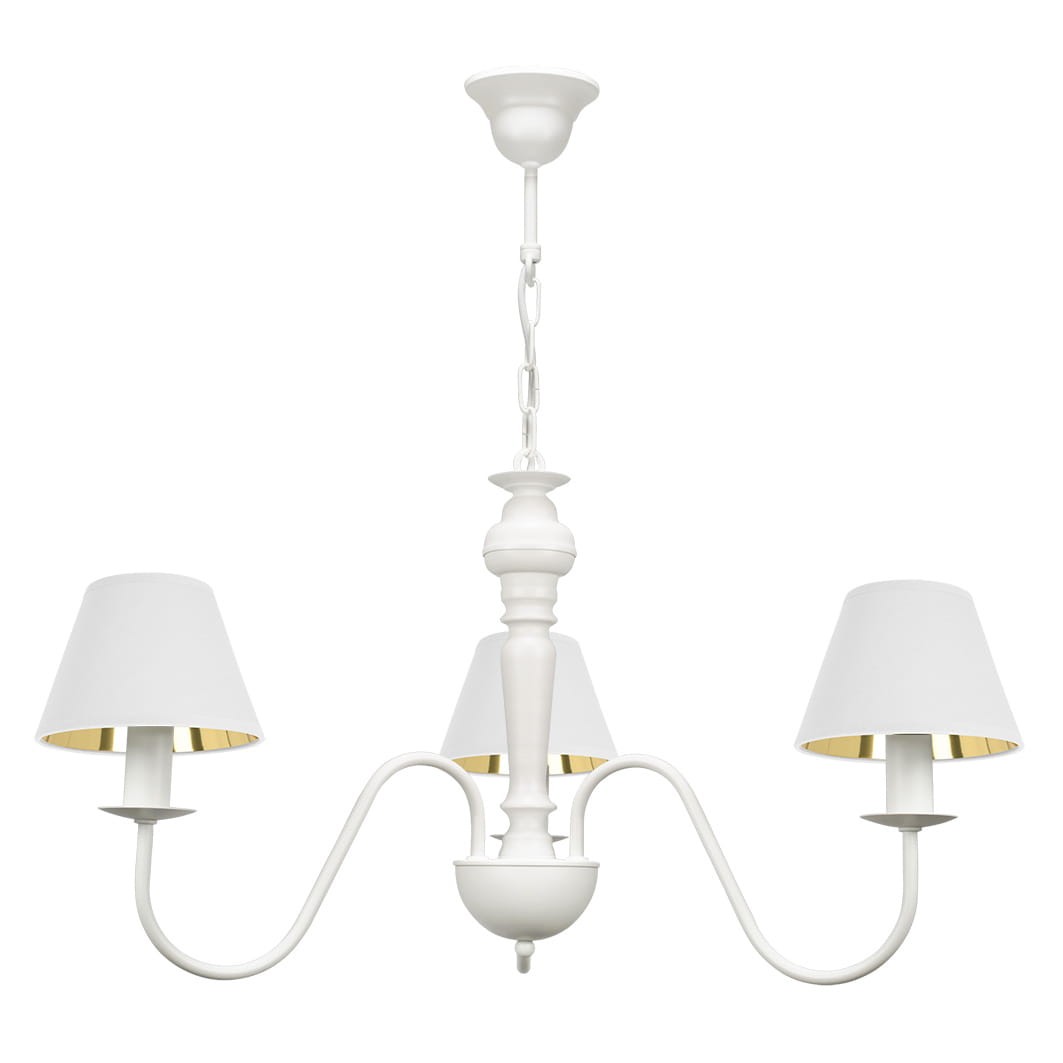 Lampa biało-złota klasyczna do salonu GOLDSUN z trzema ramionami i abażurami z białej tkaniny o złotym wnętrzu to elegancka propozycja do stylowych wnętrz. Biały stelaż w połączeniu ze złotym połyskiem wewnątrz kloszy tworzy subtelny, ale efektowny akcent. Lampa emituje ciepłe, przyjemne światło, które sprzyja relaksowi i buduje przytulną atmosferę. Doskonały wybór do sypialni, salonu lub klasycznej jadalni.