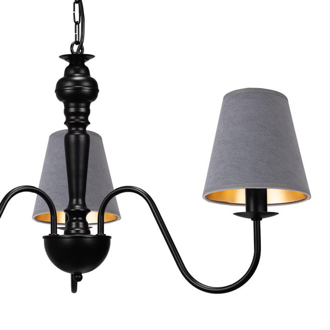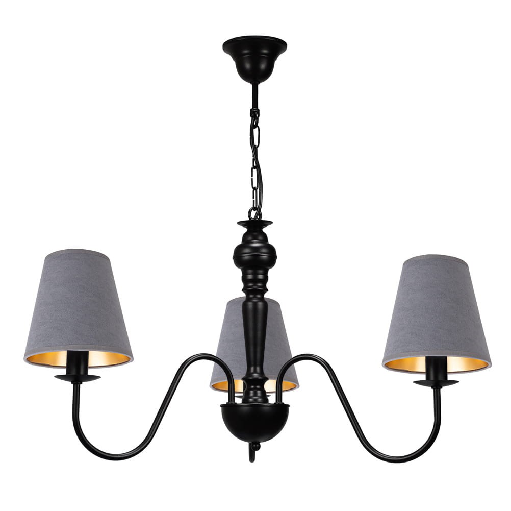 Lampa czarna do jadalni GOLDSUN w wersji trzyramiennej to klasyczna propozycja oświetlenia. Abażury wykonane z miękkiego, szarego weluru nadają lampie wyjątkowego charakteru, doskonale wpisują się w wiele aranżacji, a złote wnętrze kloszy dodatkowo ociepla światło i tworzy nastrojowy klimat. Lampa świetnie prezentuje się w salonach, jadalniach czy sypialniach utrzymanych w eleganckich odcieniach szarości. To wybór, który wprowadzi do wnętrza przytulność i wyrafinowany styl.