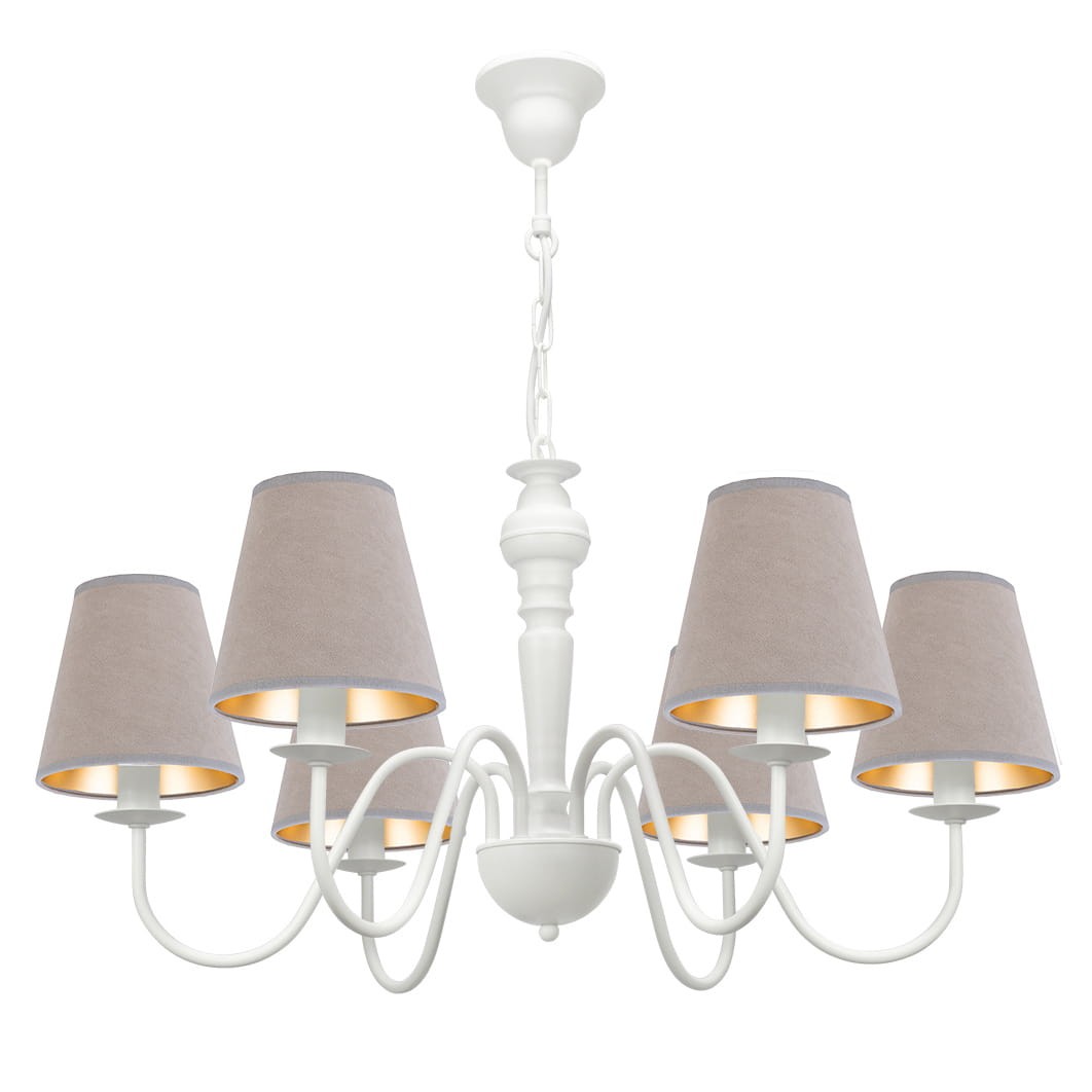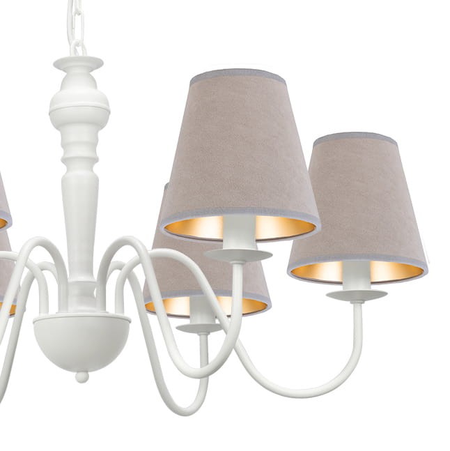 Lampa do jasnego pomieszczenia GOLDSUN 6-ramienny w białym kolorze z abażurami z beżowego weluru to spokojna i elegancka propozycja do klasycznych wnętrz. Miękka tkanina kloszy nadaje przytulności, a ich złote wnętrze daje ciepłe, delikatne światło. Lampa dobrze pasuje do salonu, sypialni i większych pomieszczeń.