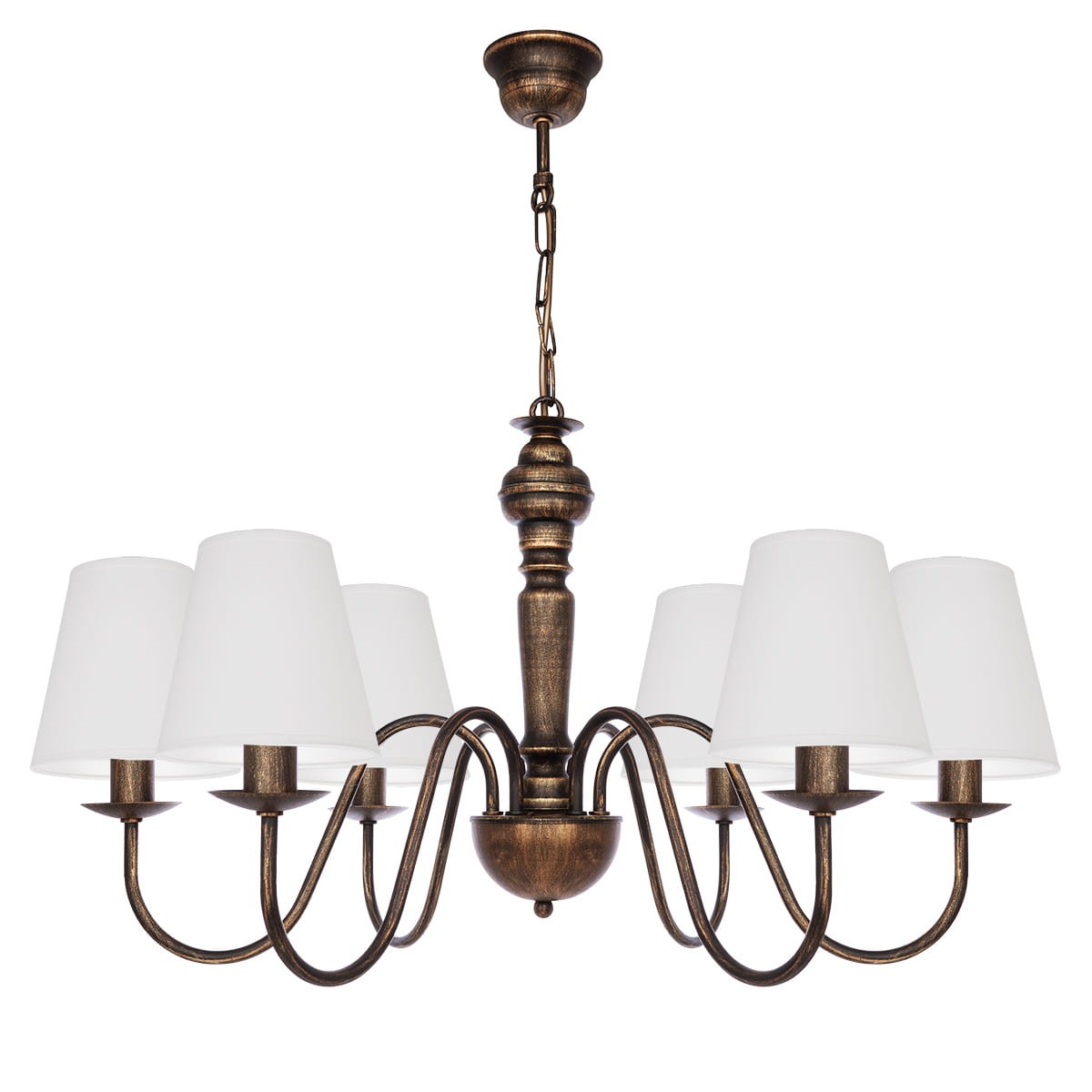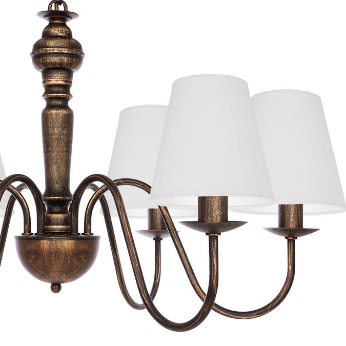 Lampa metalowa w kolorze starego złota o białych abażurach GOLDSUN z sześcioma ramionami i białymi, prostymi abażurami to elegancka lampa do dużych, przestronnych wnętrz. Stelaż w kolorze postarzanego złota i czerni przyciąga wzrok i nadaje lampie stylowy wygląd. Jasne abażury łagodzą mocny charakter stelaża i wprowadzają więcej światła. Sprawdzi się świetnie w salonie, jadalni lub dużej sypialni.