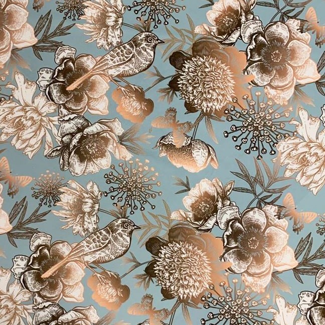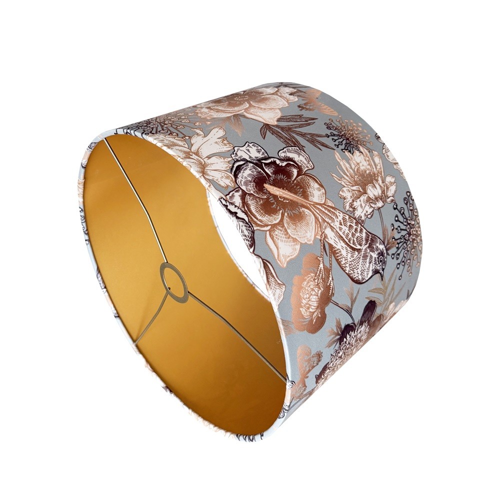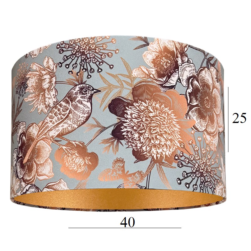 | Abażur | w kształcie walca o wymiarach średnica 40 cm, wysokość 25 cm, wykonany z tkaniny WELUROWEJ z wzorem FLOWERS, złote kwiaty i ptaszki na tle w kolorze morskim, od wewnątrz złota folia |