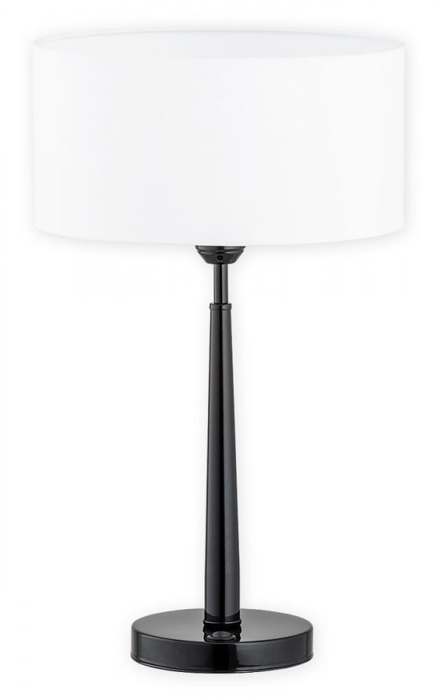 Nowoczesna lampa stołowa w klasycznym stylu w kolorze czarny połysk to model, który świetnie prezentuje się w eleganckich wnętrzach. Tkaninowy abażur w kolorze białym sprawi , że wnętrze będzie przytulniejsze.