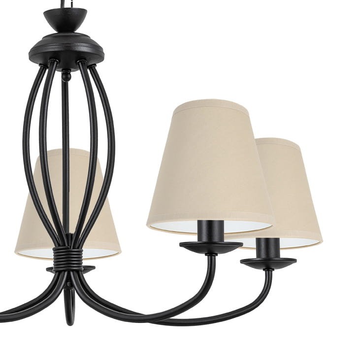 Lampa sufitowa z beżowymi abażurami OLIVER w czarnym kolorze z pięcioma ramionami i beżowymi abażurami to klasyczna lampa sufitowa klasyczna. Prosta forma sprawia, że pasuje zarówno do tradycyjnych, jak i nowoczesnych wnętrz. Pięć źródeł światła zapewnia dobre oświetlenie, a tkaninowe klosze nadają całości przyjemny wygląd. To idealny wybór do salonu lub nad stół w jadalni.