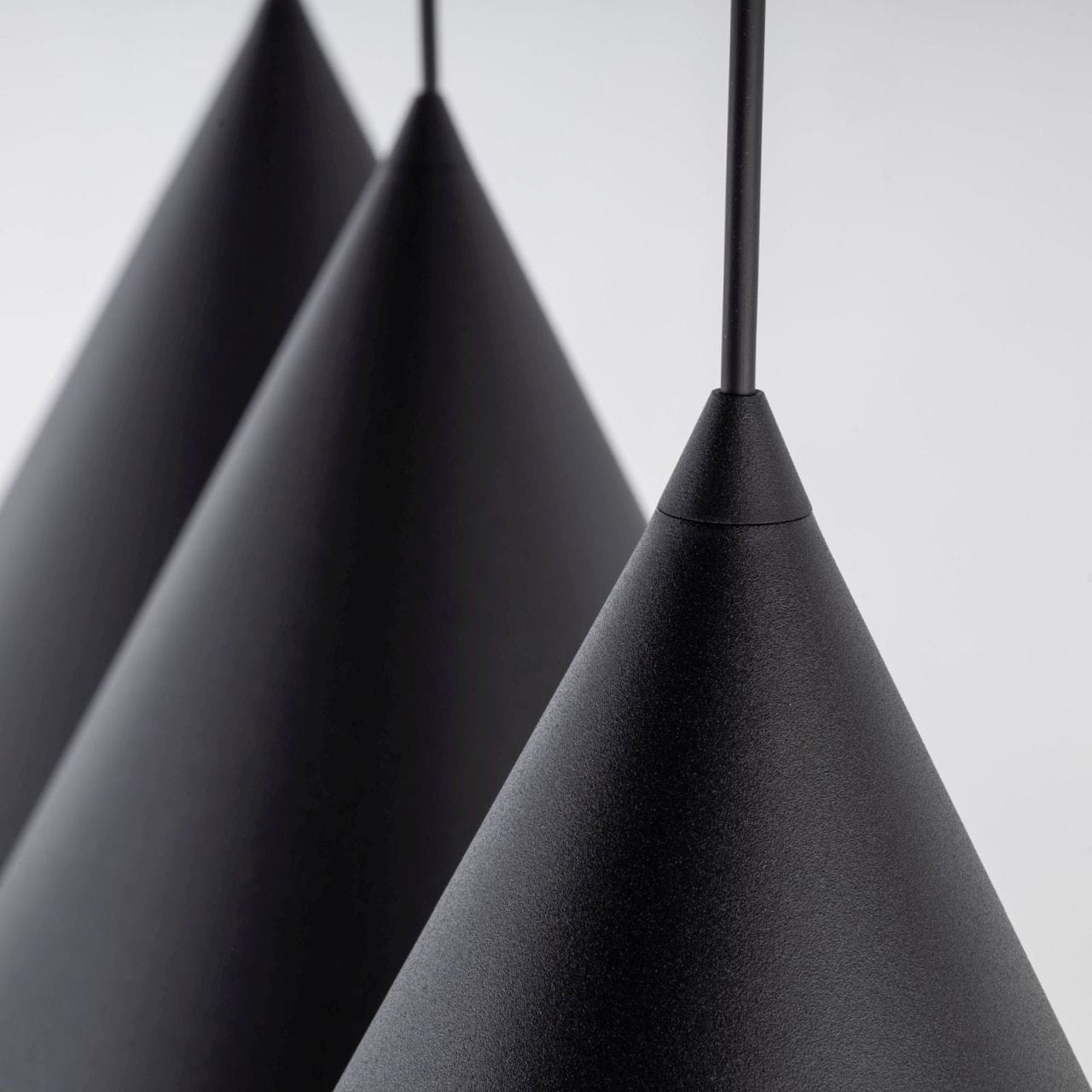 Lampa wisząca 3 punktowa z metalowymi, stożkowymi kloszami pomalowanymi na kolor głębokiej czerni. Lampa wykonana jest w stylu industrialnym z możliwością zawieszenia jej na dowolnej wysokości. Stożkowe klosze to najnowszy trend w tego typu oświetleniu, jednocześnie o ponadczasowym charakterze.