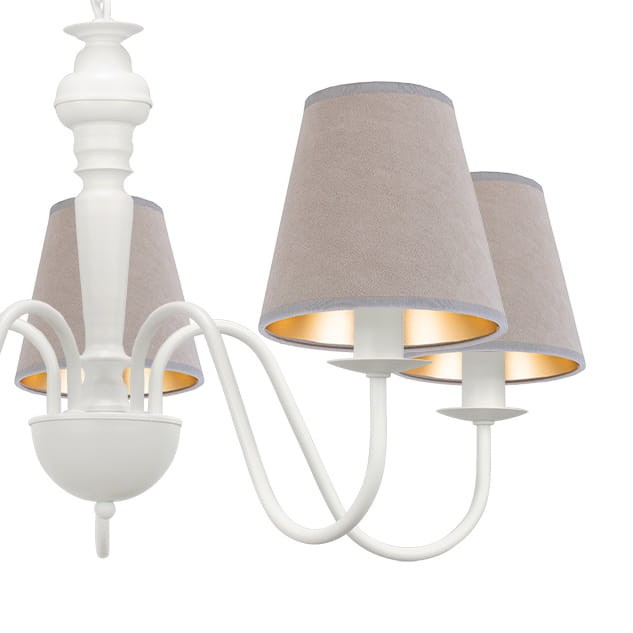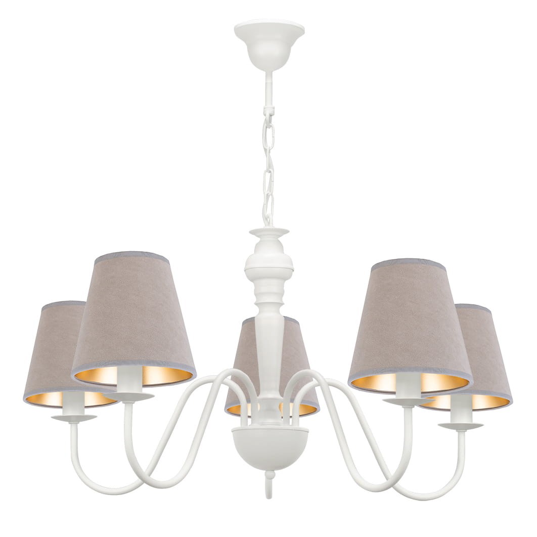 Lampa wisząca z welurowymi abażurami GOLDSUN 5-ramienny z abażurami z beżowego weluru to elegancka i ponadczasowa propozycja do wnętrz z nutą przytulności. Beżowy welur w połączeniu ze złotym wnętrzem abażurów tworzy ciepły, miękki blask, który buduje wyjątkowy nastrój. Biały stelaż nadaje całości lekkości i świeżości, sprawiając, że lampa doskonale odnajdzie się zarówno w salonie, sypialni, jak i w jadalni nad stołem.