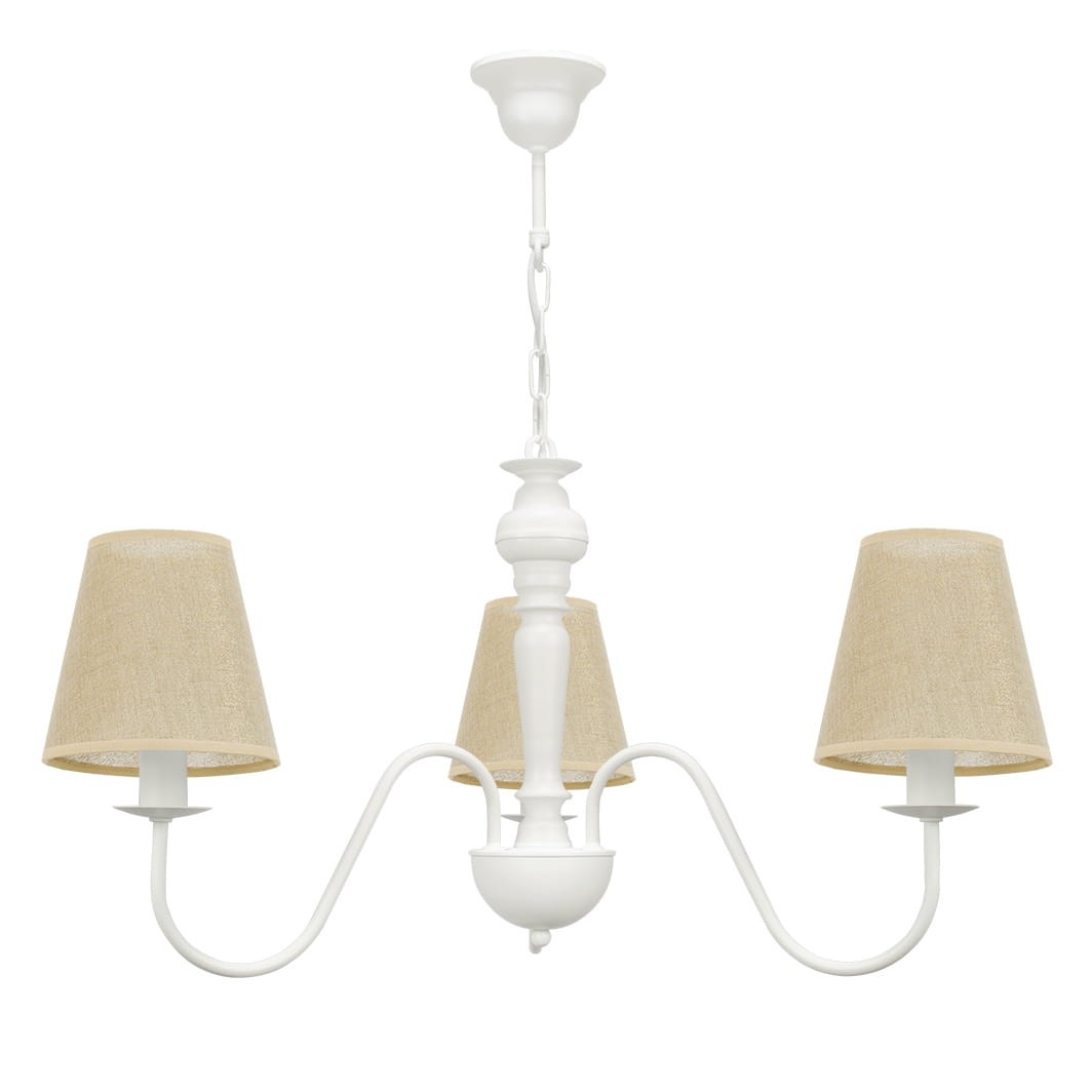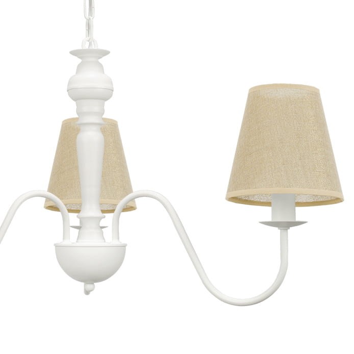 Romantyczna biała lampa z różowymi kloszami GOLDSUN z trzema punktami światła, białym metalowym stelażem i abażurami z naturalnego lnu to prosta, a zarazem elegancka propozycja do jasnych wnętrz. Klosze w beżowo-złotym odcieniu dobrze współgrają z białą konstrukcją, tworząc ciepły i harmonijny efekt. Doskonale pasuje do aranżacji w stylu skandynawskim, rustykalnym oraz klasycznym, gdzie ważna jest naturalność i stonowana kolorystyka.