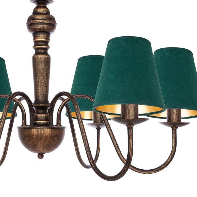 Lampa zielona o czarno-złotym stelażu GOLDSUN o sześciu symetrycznych ramionach z zielonymi, welurowymi abażurami to elegancka lampa, która doda wnętrzu wyrazistości. Głęboka zieleń kloszy pięknie pasuje do czarno-złotego stelażu o postarzonej powierzchni, tworząc stylowe i spójne połączenie. Taki model najlepiej sprawdzi się w przestronnych, pełnych roślinności salonach, jadalniach lub klasycznych gabinetach.