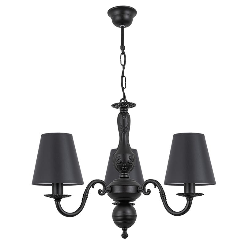 Luksusowy czarny żyrandol z abażurami. Elegancka lampa do sypialni w stylu glamour lub vintage, wzorowana na dawnych żyrandolach pałacowych. Ozdobny stelaż w matowej czerni został zestawiony z abażurami z czarnej, efektownej tkaniny, całość jest wyrazista i robi duże wrażenie. Lampa została w całości wykonana w Polsce, uwagę zwraca zarówno ciekawe wzornictwo jak i duża dbałość o detale.
