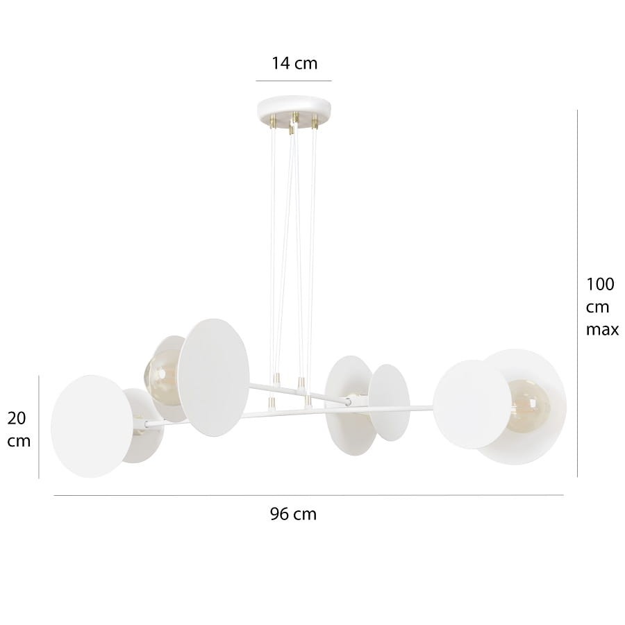 Nowoczesna biała lampa wisząca. Oryginalna lampa o ciekawym kształcie- żarówki zostały umieszczone pomiędzy kółkami z lakierowanej na biało stali, osadzonymi na prostych ramionach. Stylowa i nowoczesne alternatywa dla klasycznego żyrandola, świetnie komponuje się z jasnym, minimalistycznym wystrojem wnętrza. Lampa doskonale prezentuje się w zestawieniu ze stylizowanymi żarówkami.