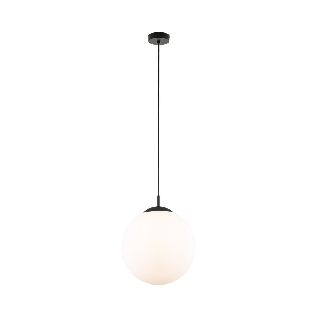 Nowoczesna czarna lampa wisząca. Wykonana z metalu pomalowanego na kolor czarny z uniwersalnym ponadczasowym białym kulistym kloszem. Świetna do zawieszenia w centralnym miejscu w kuchni nad stołem, przedpokoju, czy w jadalni. Wykonana bardzo starannie przez polskiego producenta.