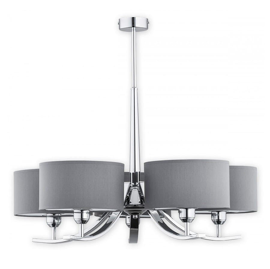 Nowoczesna lampa sufitowa do salonu wyróżnia się eleganckim, lecz prostym wzornictwem. Tkaninowe abażury w kolorze szarym ocieplają całość. Produkt polski.