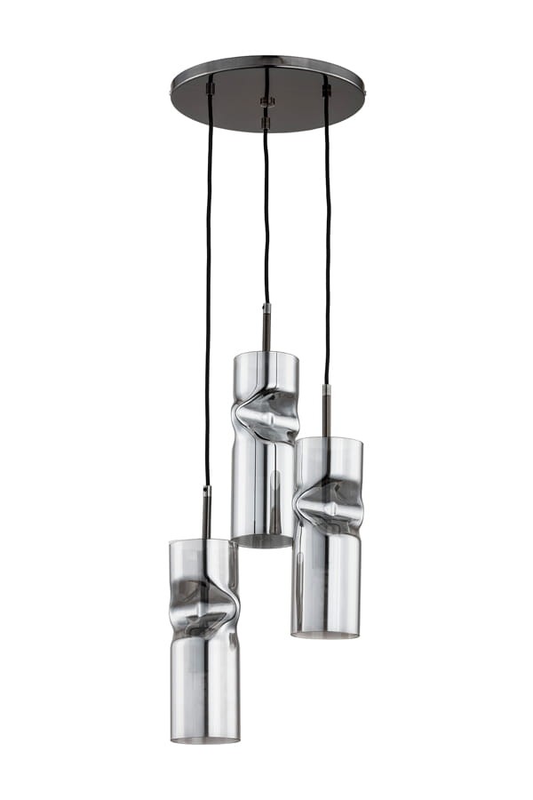 Nowoczesna potrójna lampa do salonu. Ciekawy model ze szklanymi kloszami o niebanalnym kształcie. Czarno-grafitowa kolorystyka będzie pasowała do wielu nowoczesnych aranżacji.