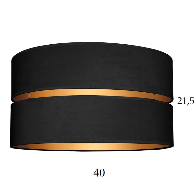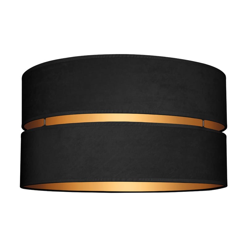 Nowoczesny abażur do lampy walec, wykonany z WELURU w kolorze czarnym ze złotym wnętrzem. Abażur można zamontować zarówno do lampy podłogowej jak i wiszącej. Abażur składa się z dwóch połączonych ze sobą walców, z przerwą po środku, przez którą przenika światło, co daje bardzo ciekawy efekt, w postaci refleksów na ścianie.