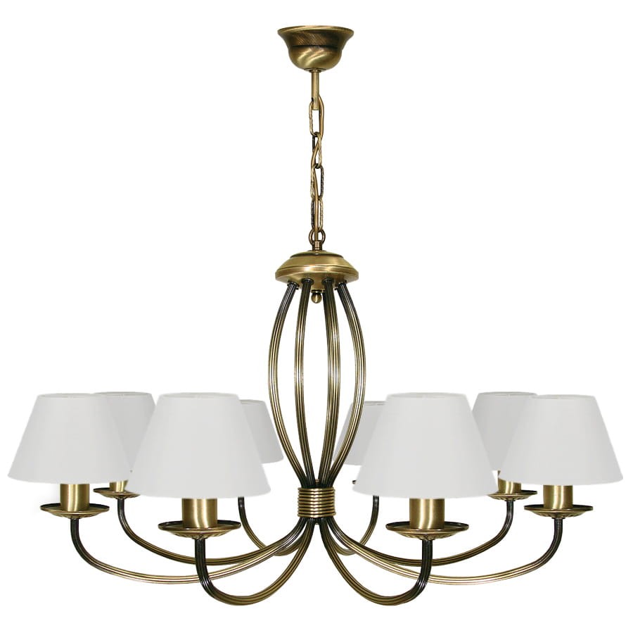 Okazały żyrandol do salonu. Piękny żyrandol w odcieniu patynowanego złota, zwieńczony białymi abażurkami z najwyższej jakości tkaniny robi duże wrażenie. Lampa nawiązuje kształtem do dawnych żyrandoli pałacowych i wspaniale wygląda w tradycyjnych stylizacjach. 8-ramienny żyrandol najlepiej sprawdza się w przestronnych wnętrzach jak salony, hole czy jadalnie, będzie też świetnie zdobił wnętrza użytkowe- hotelowe czy restauracyjne.