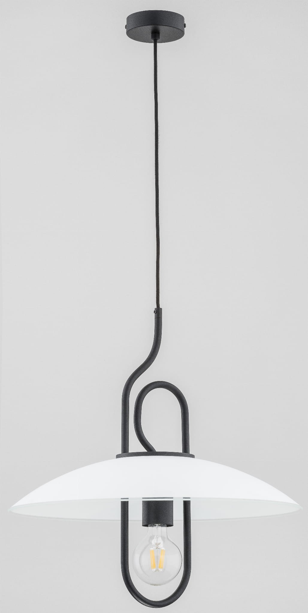 Oryginalna czarna lampa z kloszem. Nowocześnie zaprojektowana lampa wisząca ze stelażem w kolorze czarnym oraz szklanym białym kloszem będzie z pewnością świetnym dodatkiem do każdej kuchni. Wykonana bardzo starannie przez polskiego producenta.