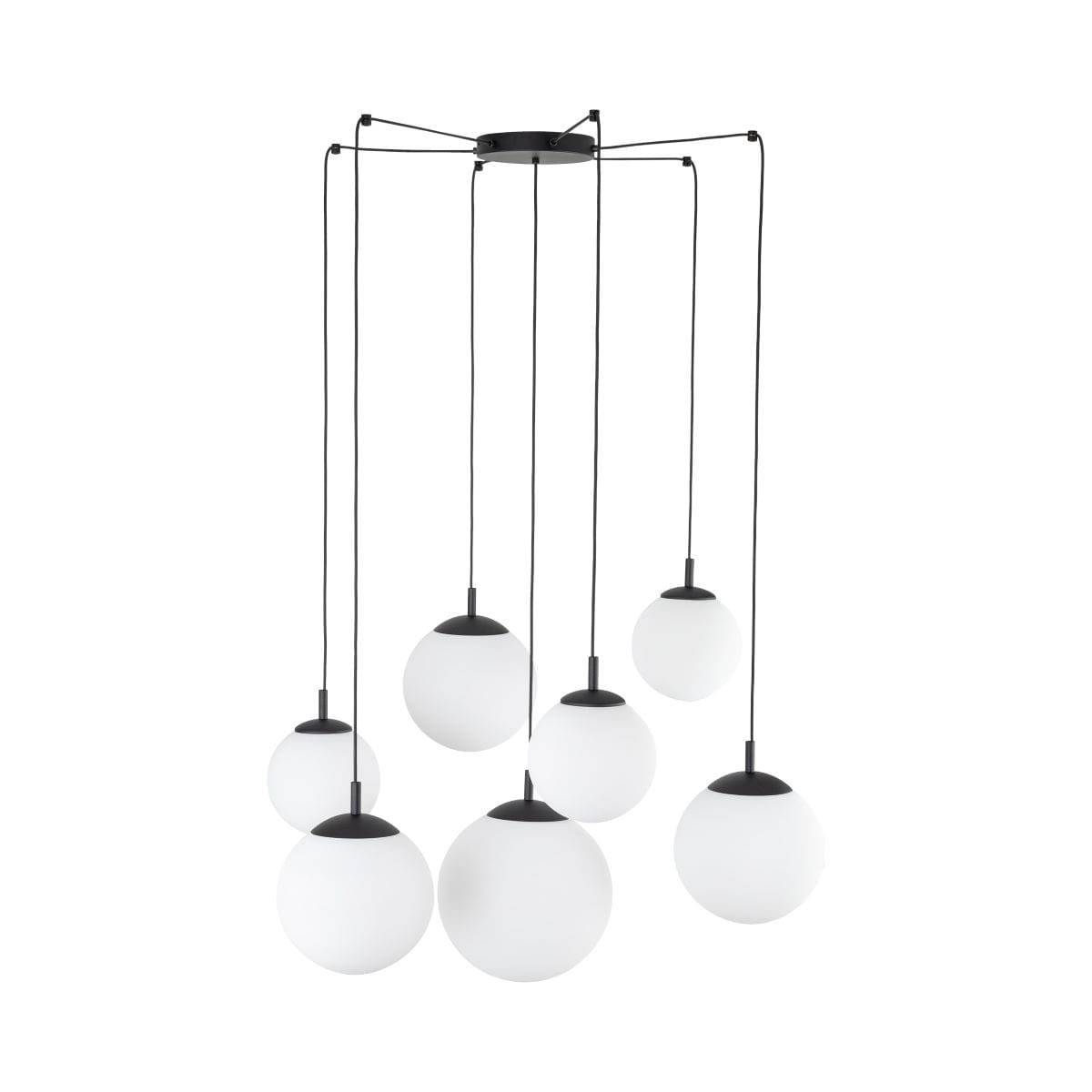 Oryginalna lampa wisząca z kloszami do salonu to model lampy z serii ESEMO. Wykonana z metalu pomalowanego na kolor czarny z oryginalnymi białymi kloszami różnej wielkości, z pewnością będzie znakomitą ozdobą wielu stylowych aranżacji wnętrz. Idealna do zawieszenia w salonie, czy dużym holu. Wykonana bardzo starannie przez polskiego producenta.