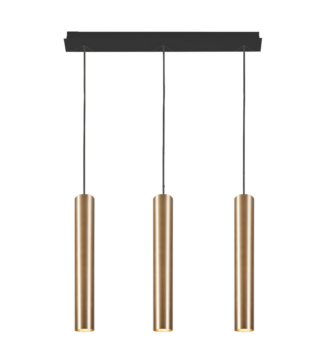 Oryginalna potrójna lampa wisząca do salonu. Piękna lampa o prostym kształcie- 3 mosiężne tuby zostały zawieszone na prostokątnej długiej podsufitce. Znakomite połączenie prostego kształtu i bogatego, złocistego wykończenia. Lampa wisząca EJE idealnie pasuje do modnych i nowoczesnych wnętrz z ciekawymi akcentami.