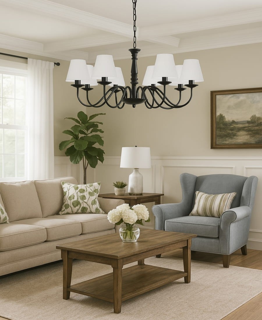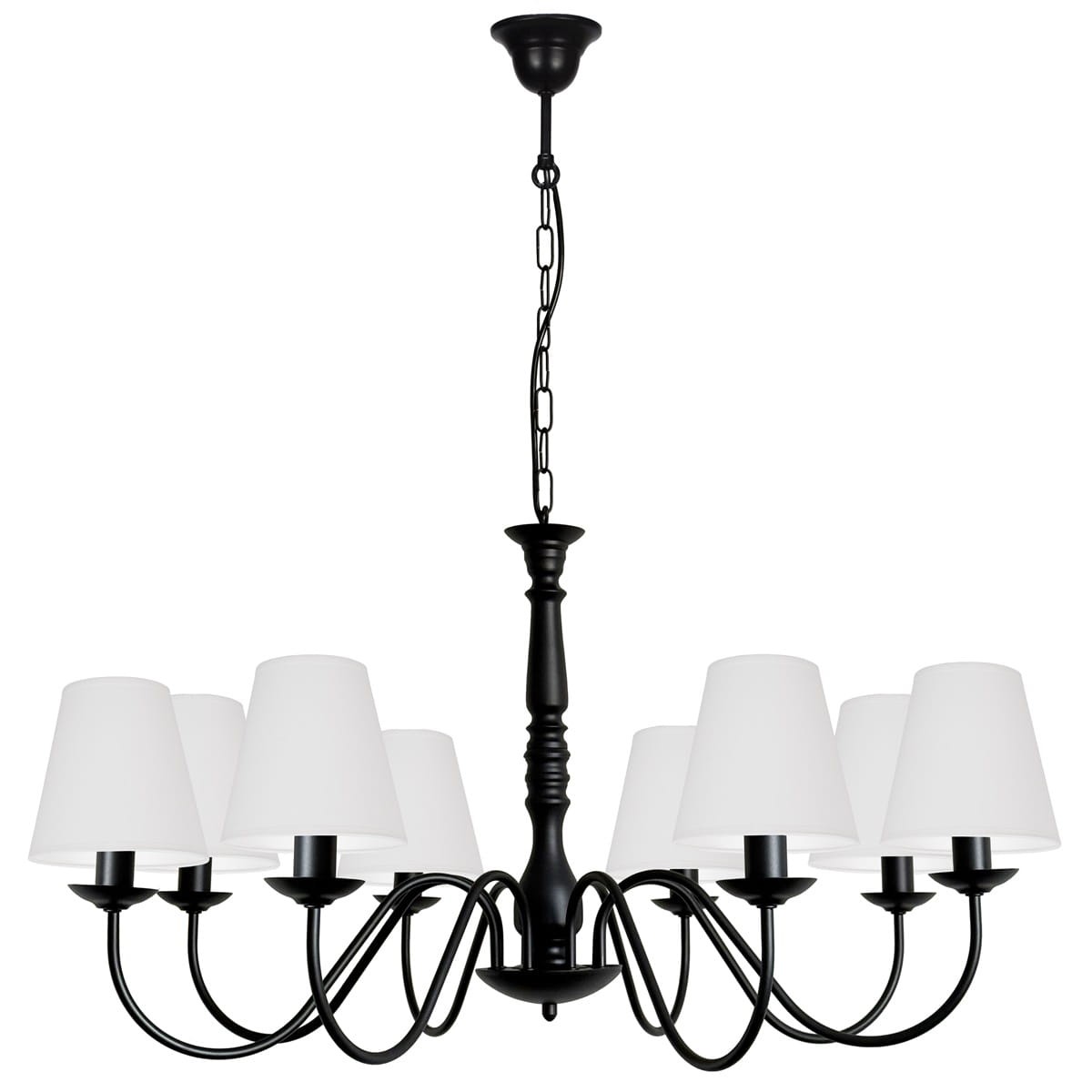 Ośmiopłomienny czarny żyrandol klasyczny JASMIN to duża lampa wisząca dedykowana do wnętrz urządzonych w stylu klasycznym, pałacowym lub rustykalnym. Czarny żyrandol JASMIN zachwyca swoim eleganckim korpusem, który składa się ze zdobionego środka oraz długich ramion delikatnie wygiętych, na końcu których znajdują się abażury wykonane z białej tkaniny, która pięknie przepuszcza światło, tworząc przytulny klimat we wnętrzu. Metalowy stelaż został pomalowany na kolor czarny i tworzy elegancką całość z abażurkami. Żyrandol sprawdzi się jako oświetlenie nie tylko do dużych salonów ale także do restauracji, czy hoteli.