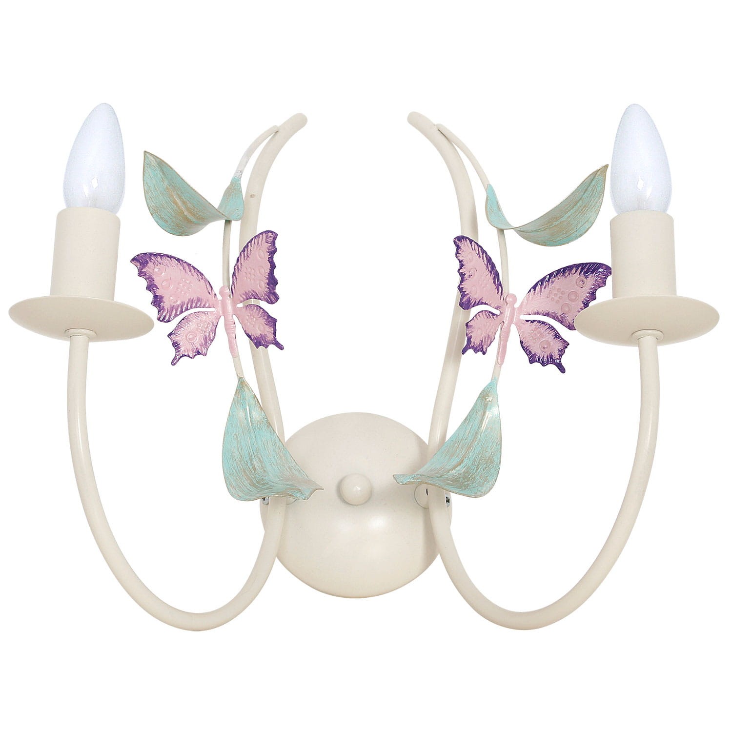 Ozdobny podwójny kinkiet ścienny. Piękny efektowny podwójny kinkiet ścienny, bardzo ciekawie zaprojektowany z oryginalnymi kolorowymi dodatkami w postaci motyli. Zwraca uwagę. Idealny do stylowych klasycznych wnętrz.