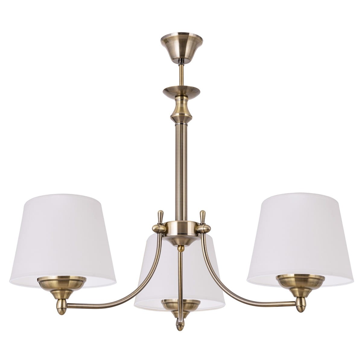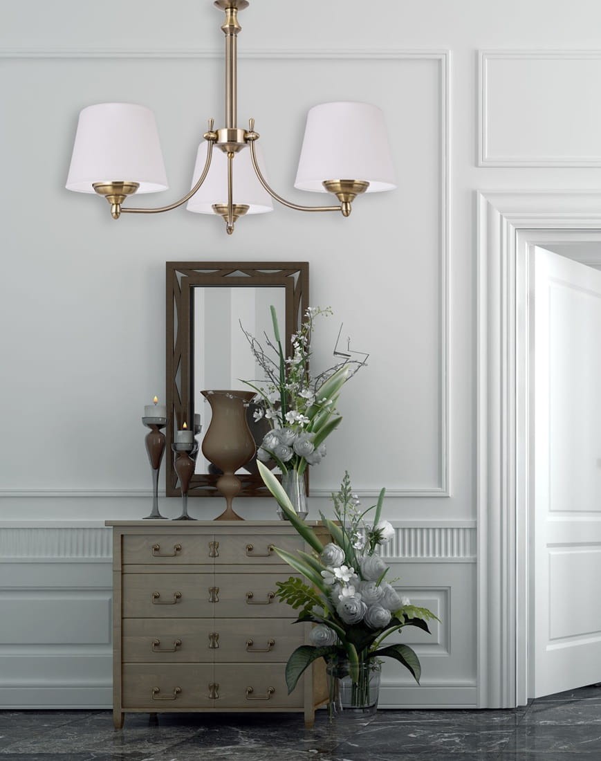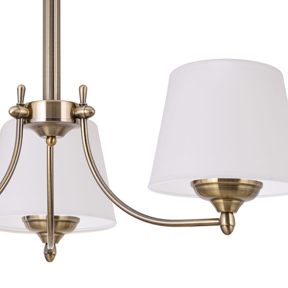 Patynowy klasyczny żyrandol. Klasyczny, stylowy żyrandol na patynowym stelażu w zestawie z uniwersalnymi białymi abażurami będzie idealnym dodatkiem oświetleniowym do każdego salonu, sypialni i jadalni. Zaprojektowany i wykonany z należytą starannością.