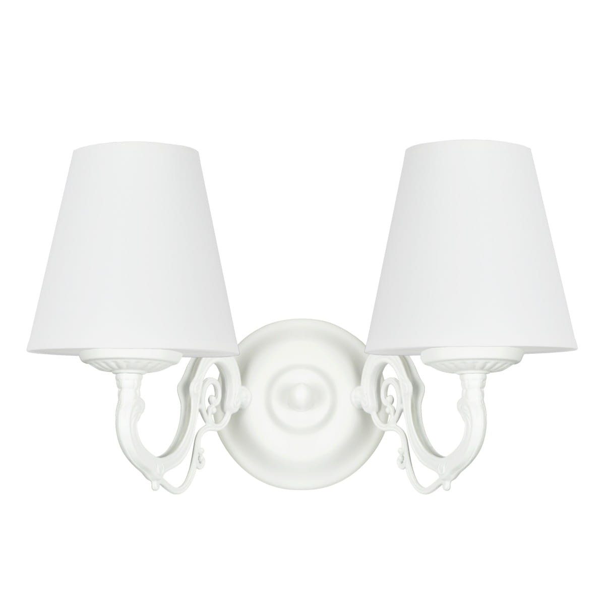 Podwójna biała lampa na ścianę. Klasyczny kinkiet ze zgrabnymi abażurami, cały w uniwersalnej bieli. Ta zachwycająca lampa ścienna będzie ozdobą wielu aranżacji- w towarzystwie jasnej kolorystyki prezentuje się zachwycająco. Kinkiet wysokiej jakości, polskiej produkcji.