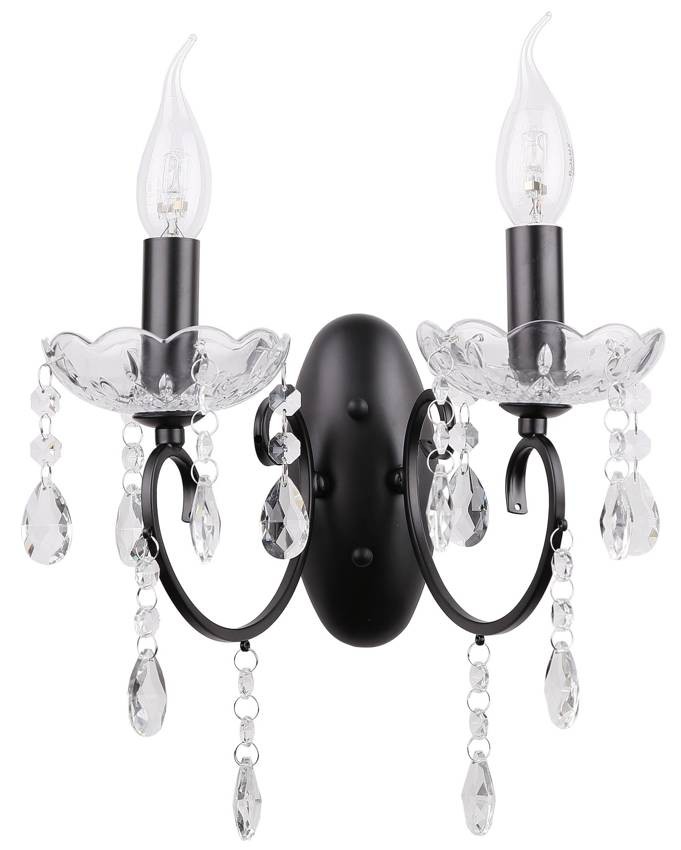 Podwójny czarny kinkiet z kryształkami. Niezwykle elegancki czarny podwójny kinkiet świecznikowy dedykowany stylowym wnętrzom. Dodatkową ozdobą kinkietu są piękne mieniące się i odbijające światło kryształki.