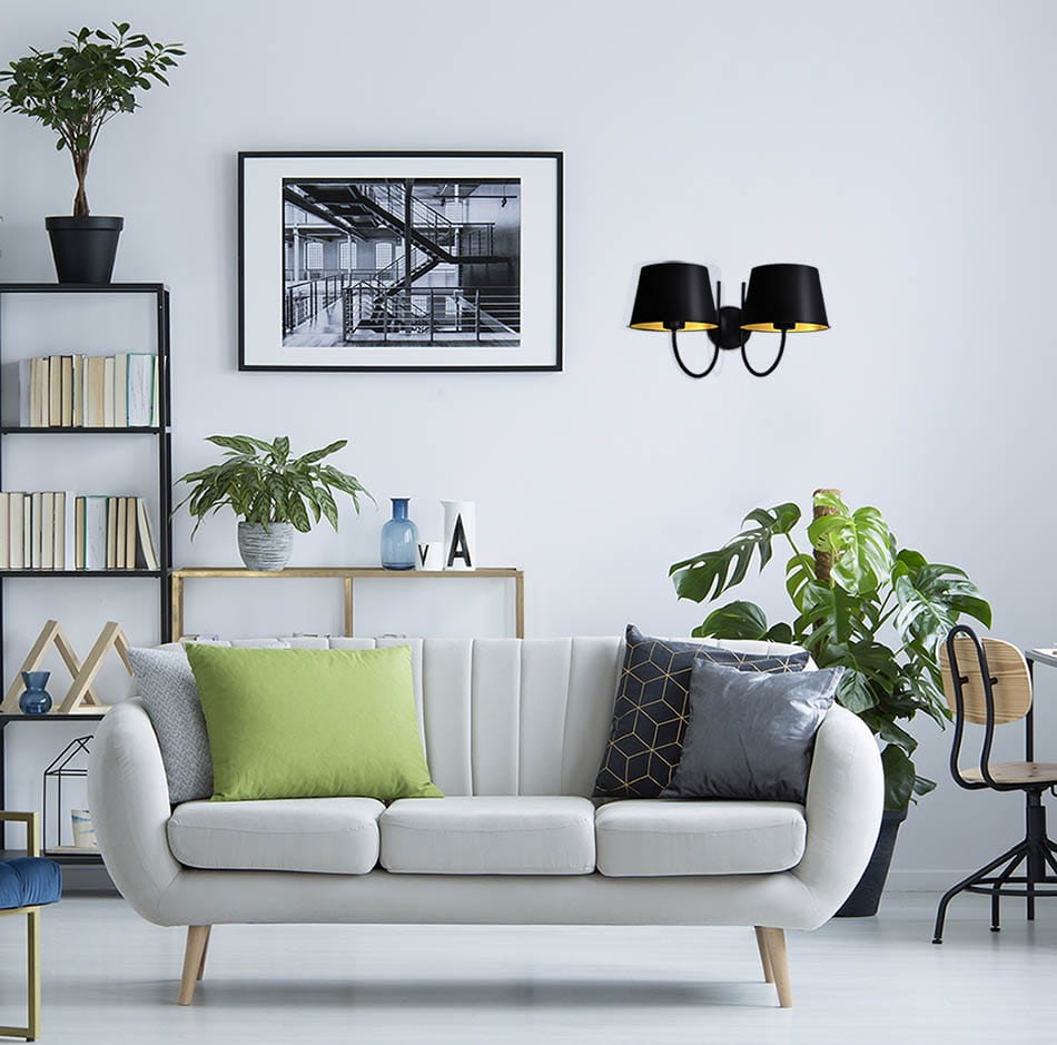 Podwójny elegancki kinkiet na ścianę. Czarny elegancki kinkiet ścienny w zestawie z klasycznymi czarno-złotymi abażurami świetny do powieszenia jako dodatkowe źródło światła do sypialni i nie tylko. Producent polski.