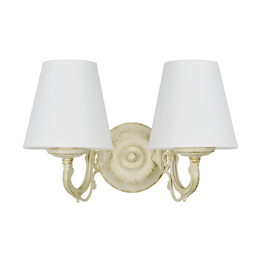 Podwójny kinkiet ecru w modnym prowansalskim stylu. Efektowny kinkiet patynowany złotem, na ozdobnym stelażu z odlewanymi elementami. Nasz kinkiet to idealny dodatek do klasycznych aranżacji, świetnie prezentuje się zarówno w salonie, jak i w przedpokoju, idealnie pasuje do naszych żyrandoli z serii VIOLA.