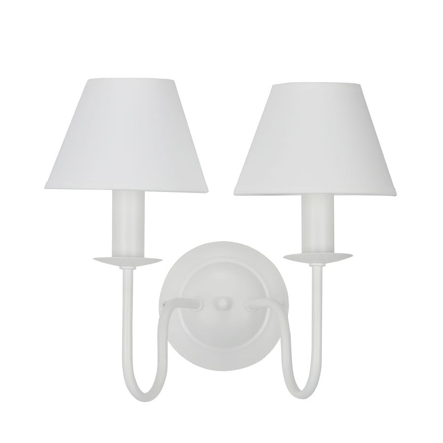Podwójny kinkiet prowansalski doda wnętrzu niepowtarzalnego uroku. Piękny kinkiet ze stożkowymi abażurami z tkaniny prezentuje się bardzo elegancko, będzie świetnym dodatkiem do sypialni czy pokoju dziecięcego zaaranżowanych w palecie delikatnych barw.