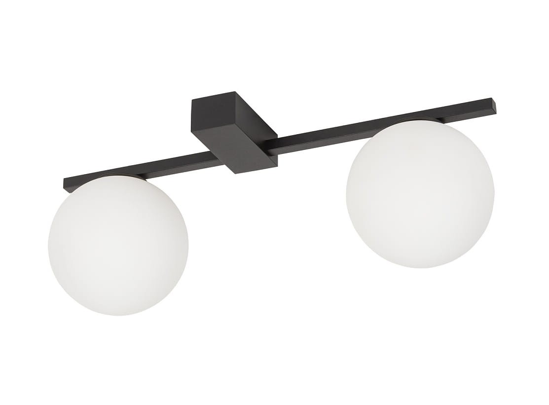 Podwójny kinkiet ścienny. Oryginalny, pięknie zaprojektowany podwójny kinkiet czarny w zestawie z białymi szklanymi kloszami w kształcie kuli będzie niepowtarzalnym dodatkiem w każdej stylowej sypialni i nie tylko. Wprowadzi subtelne, delikatne światło.