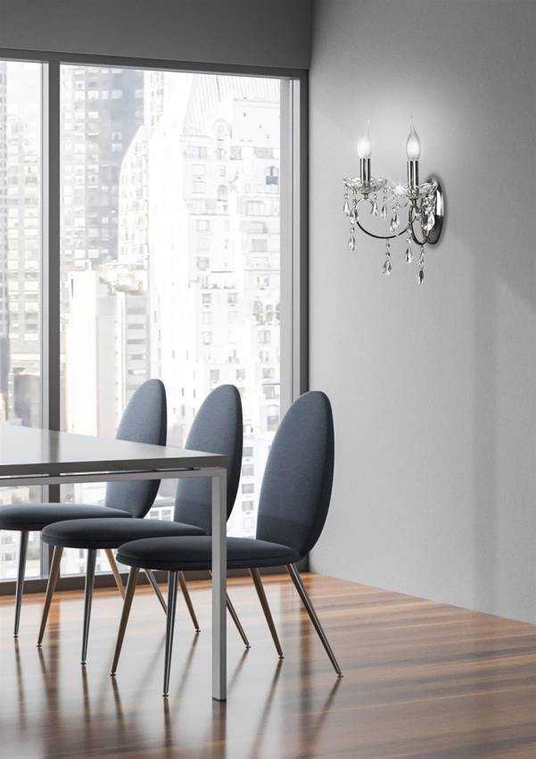 Podwójny kinkiet ścienny z kryształkami. Oryginalny podwójny kinkiet świecznikowy dedykowany stylowym wnętrzom. Dodatkową ozdobą kinkietu są piękne mieniące się i odbijające światło kryształki.