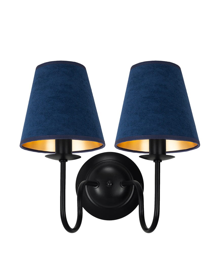 Podwójny kinkiet z granatowymi welurowymi abażurami GOLDSUN z granatowymi abażurami z weluru to stylowa propozycja do eleganckich wnętrz. Głęboki odcień tkaniny w połączeniu z czarnym stelażem tworzy wyrazisty i gustowny zestaw. Welur nadaje całości szlachetnego wyglądu, a dwa punkty światła dobrze doświetlają przestrzeń, sprawdzając się jako ozdobny i funkcjonalny dodatek do salonu, sypialni lub holu.