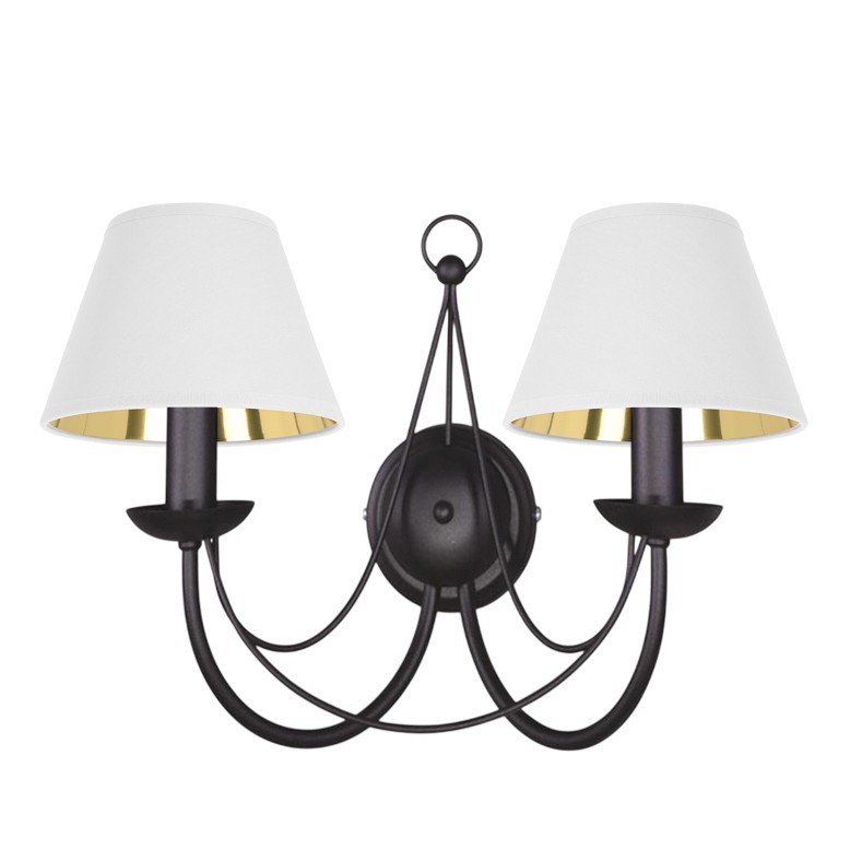 Podwójny klasyczny kinkiet na ścianę do salonu lub do przedpokoju. Podwójny na oryginalnym czarnym stelażu kinkiet świecznikowy, z eleganckimi biało-złotymi abażurami będzie świetny do powieszenia jako dodatkowa lampa w sypialni lub jako dodatkowe źródło światła w przedpokoju. Kinkiet podwójny idealny do wnętrz urządzonych w klasycznym stylu, wykonany przez polskiego producenta.