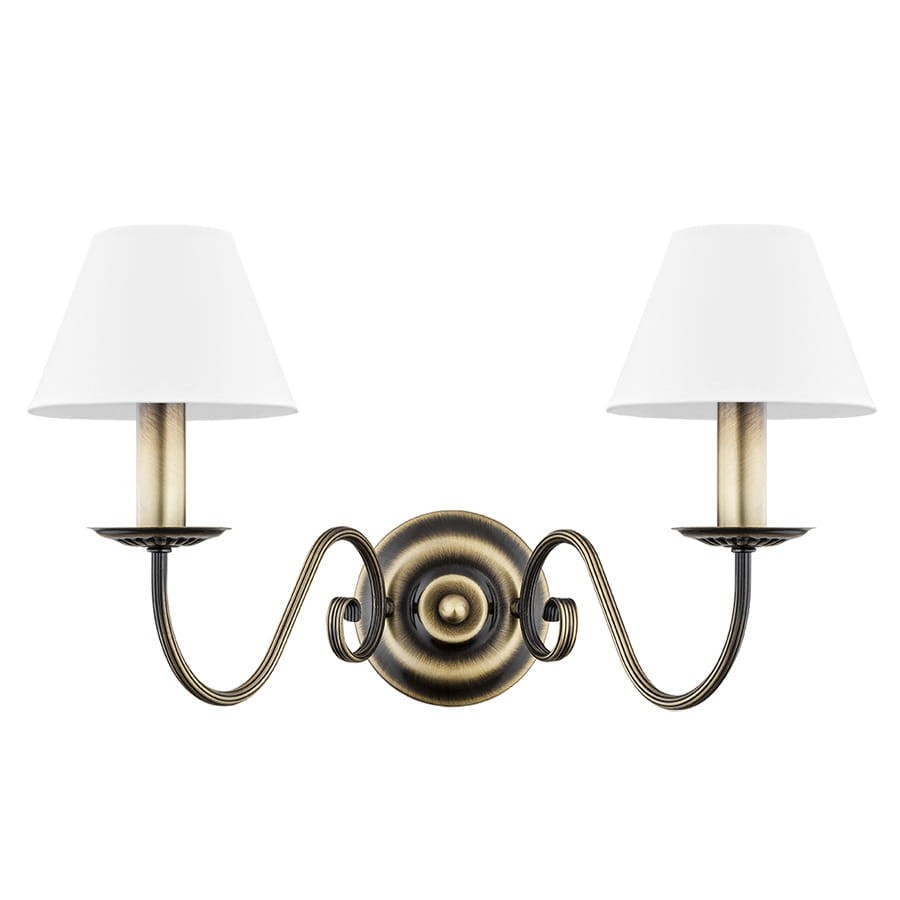 Podwójny patynowany kinkiet z abażurami z białej tkaniny. Zdobiony stelaż nadaje lampie elegancki charakter, który został także podkreślony dzięki zastosowaniu niebanalnej kolorystyki. Lampa ścienna pasuje do wnętrz klasycznych i nie tylko.