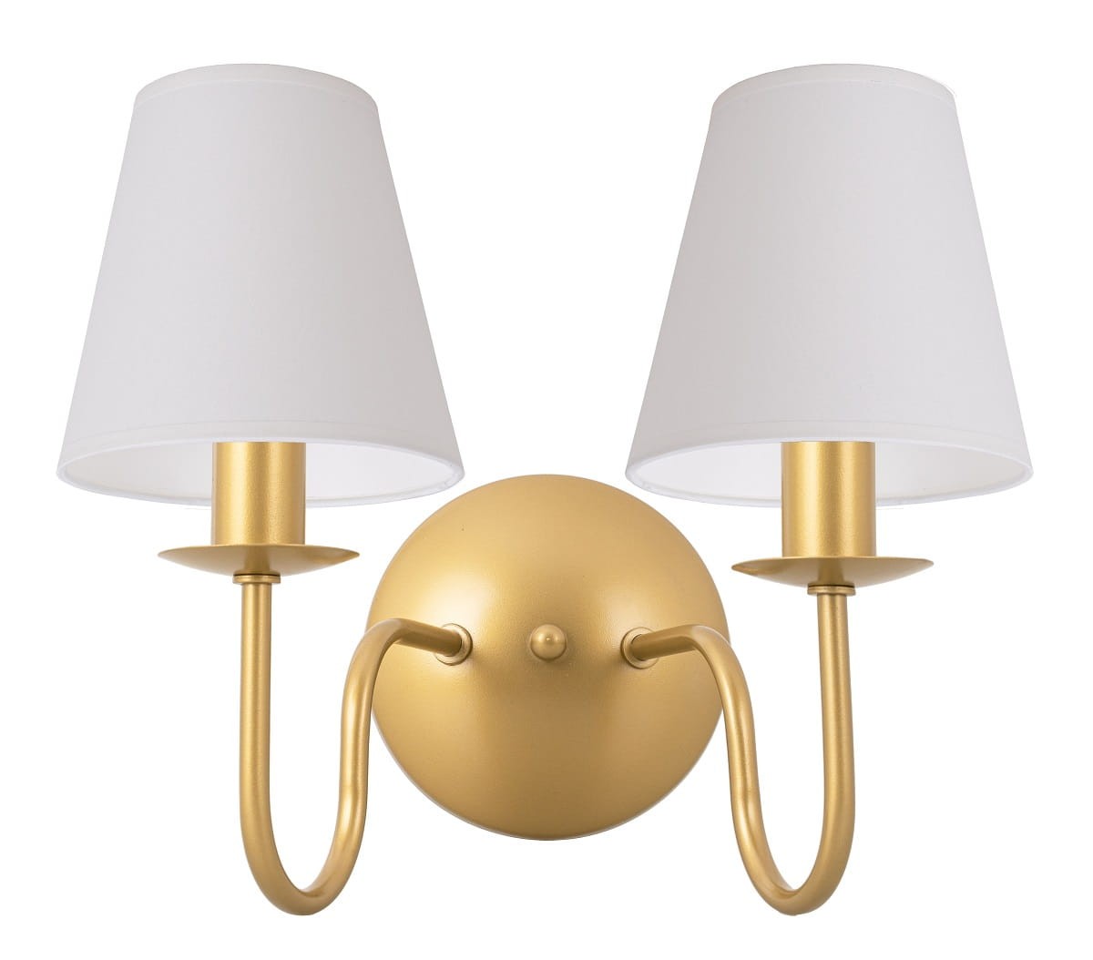 Podwójny złoty kinkiet z abażurami. Bardzo efektowna lampa na ścianę z pięknymi abażurami z wysokiej jakości tkaniny. Kinkiet będzie wspaniale prezentować się w modnych wnętrzach. Białe abażury wyglądają bardzo stylowo i wspaniale rozświetlają pomieszczenie.