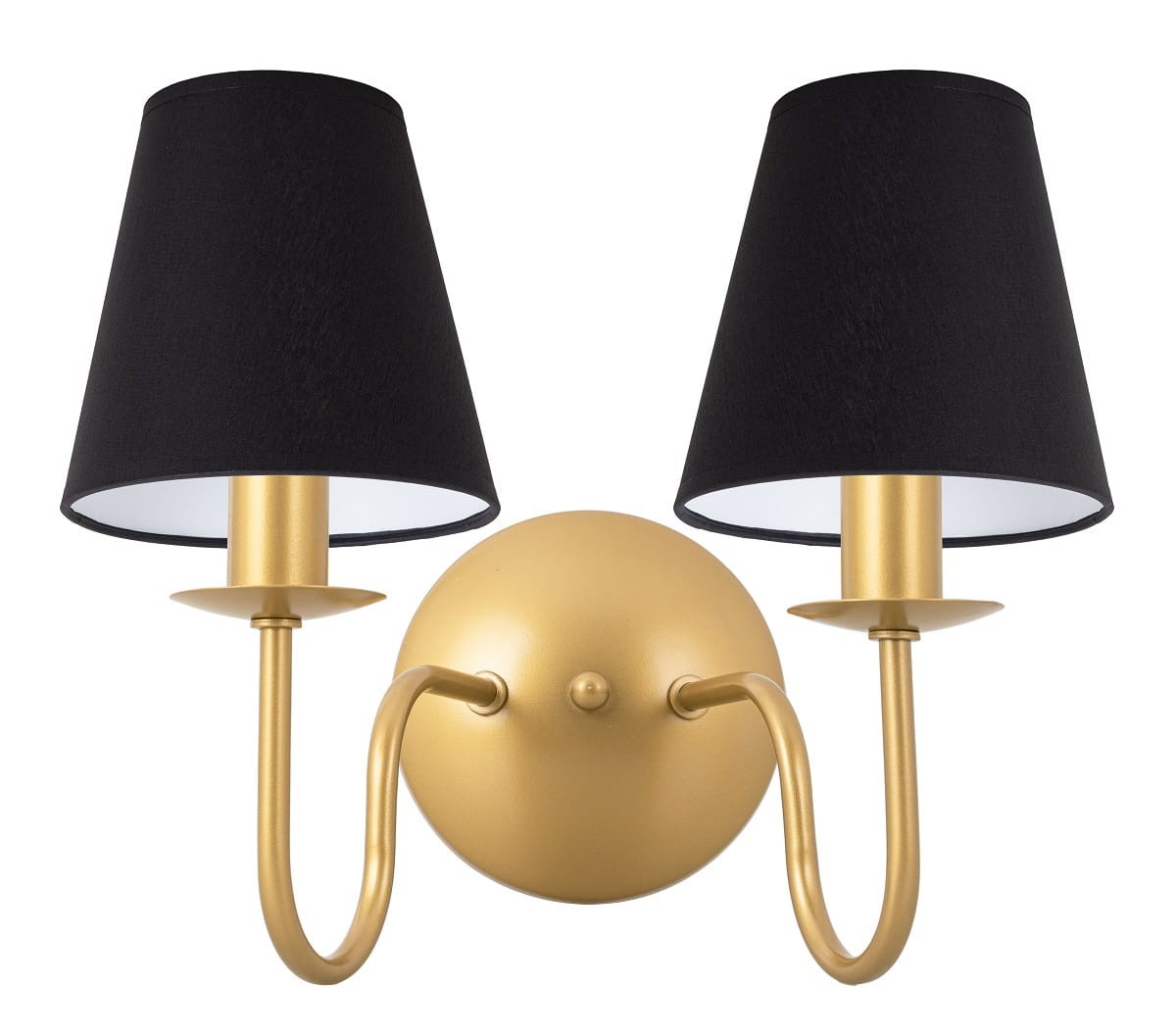 Podwójny złoty kinkiet z czarnymi abażurami. Bardzo stylowa i efektowna lampa na ścianę z pięknymi czarnymi abażurami z wysokiej jakości tkaniny oraz oryginalny i szykowny złoty stelaż. Kinkiet będzie wspaniale prezentować się w modnych wnętrzach.