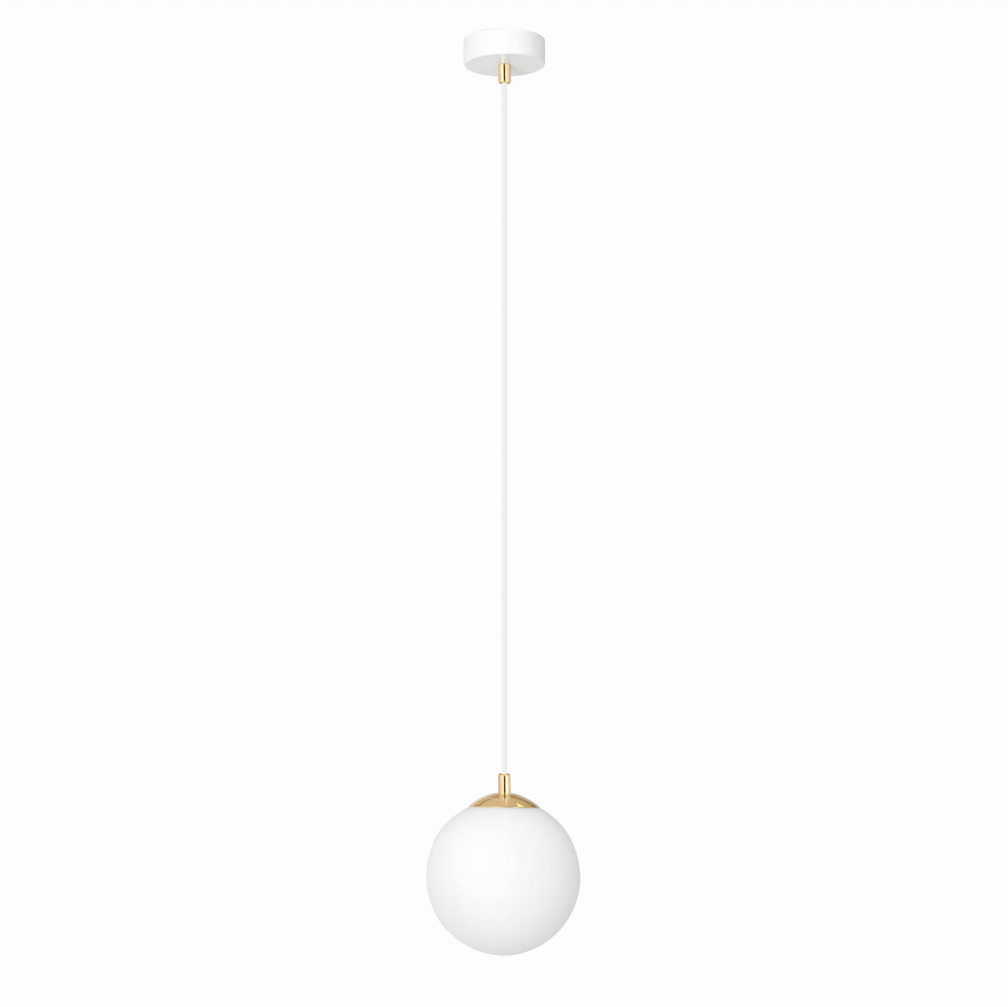 Pojedyncza biała lampa z kloszem. Ciekawa lampa o prostym, lecz oryginalnym kształcie, zwieńczona szklanym, kulistym kloszem. Żyrandol świetnie podkreśli nowoczesny wystrój, złote akcenty dodają lampie elegancji. Wysokiej jakości lampa od polskiego producenta.