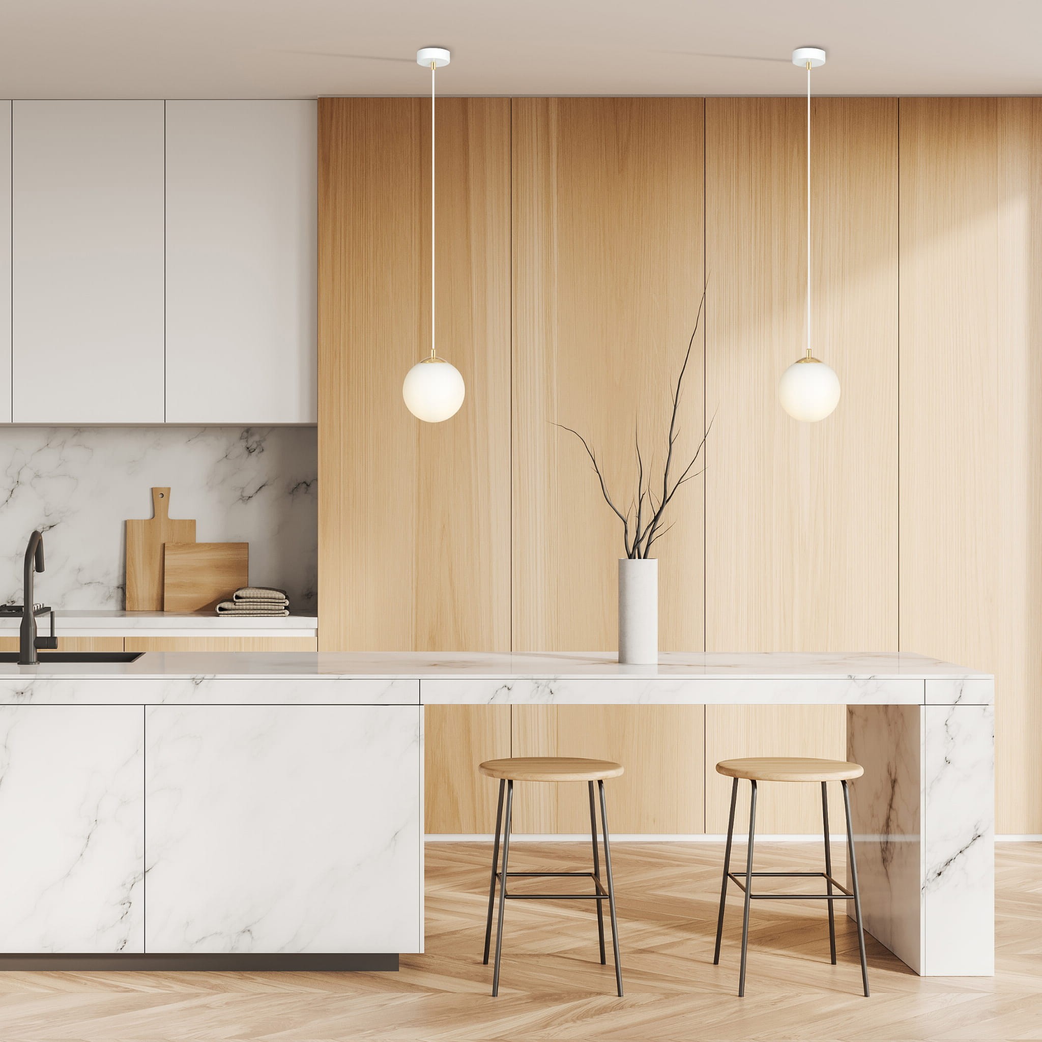 | Materiał | stal lakierowana na biało, złote dodatki, szklane klosze |