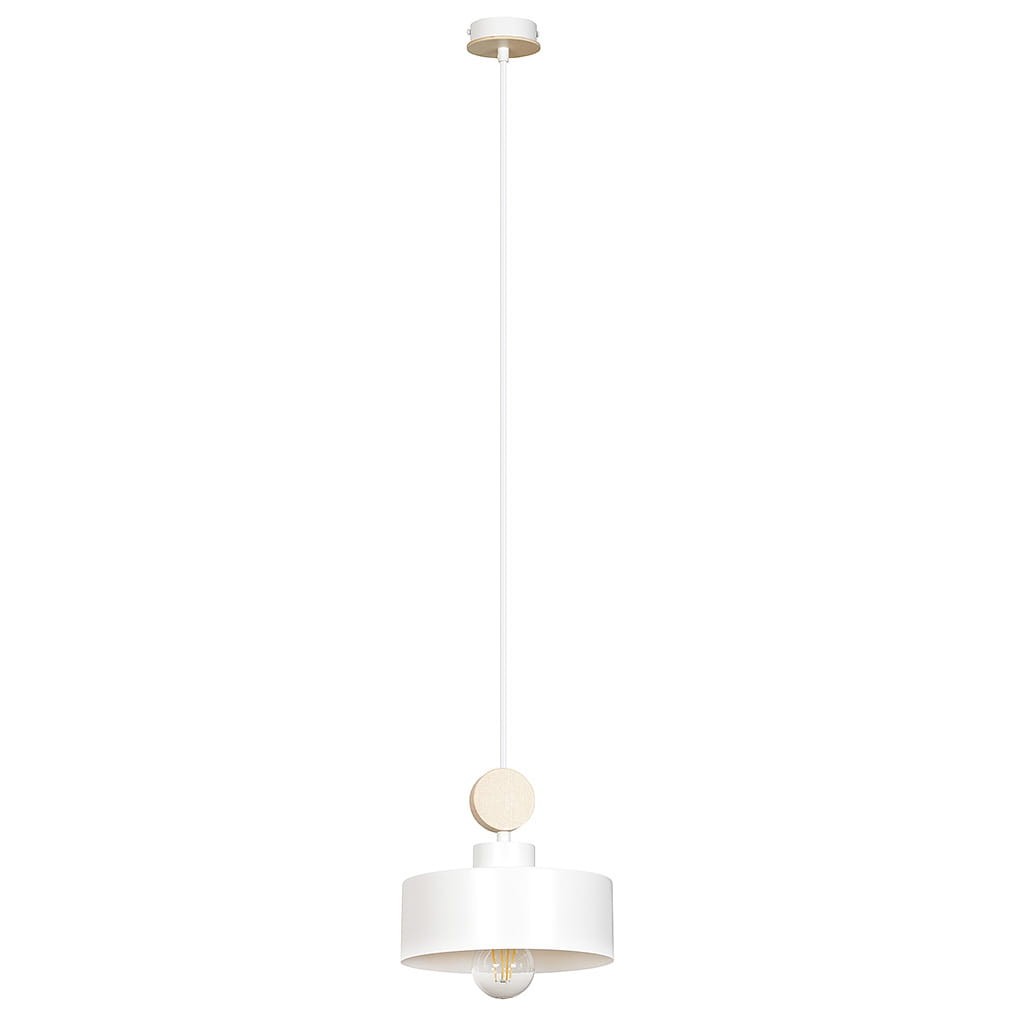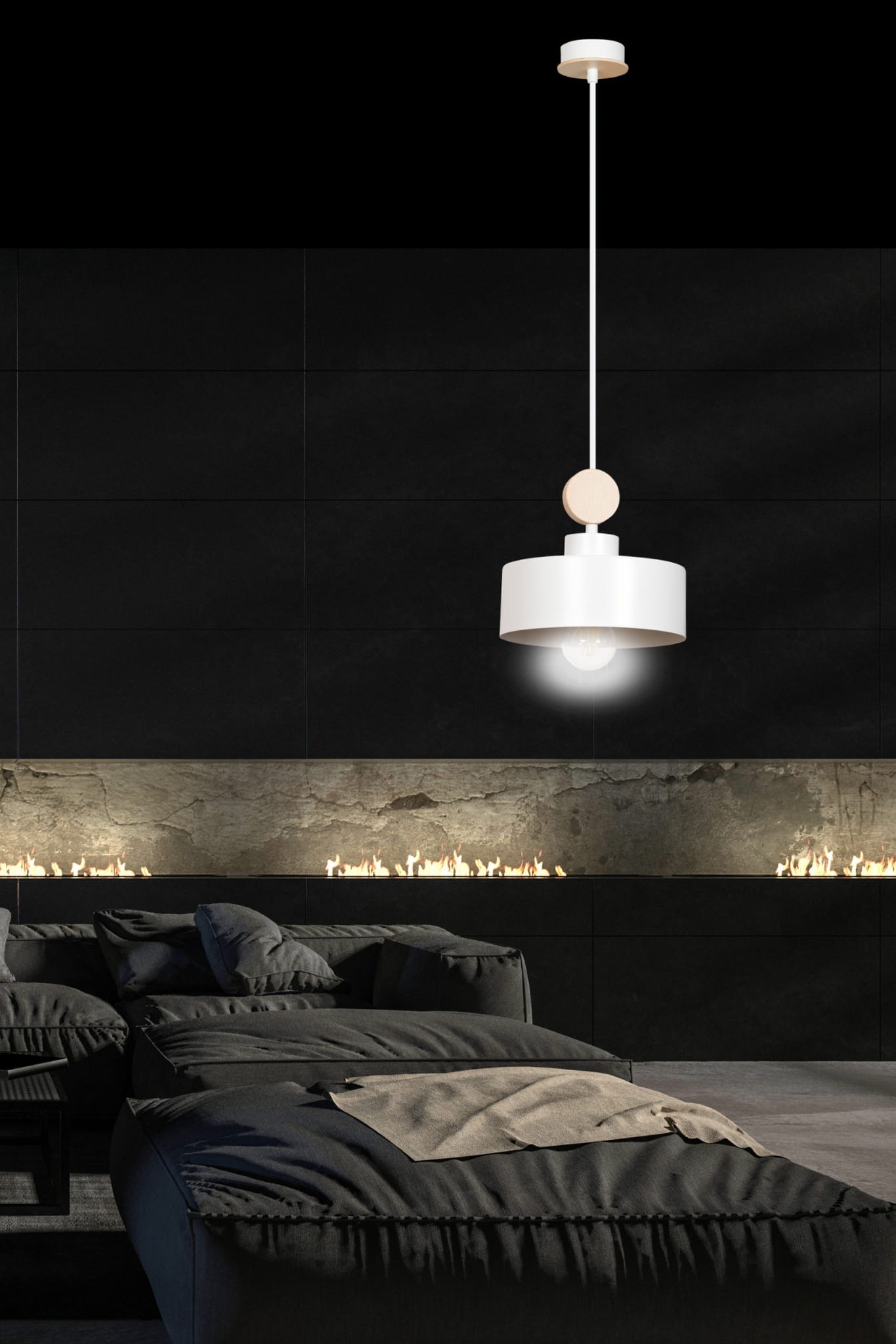 Pojedynczy biały zwis. Uniwersalna biała lampa, która pięknie komponuje się ze współczesnym, minimalistycznym wystrojem wnętrz. Połączenie bieli i drewna prezentuje się wyjątkowo elegancko.