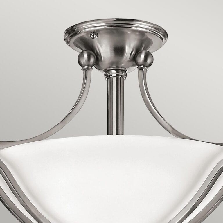 Półplafon sufitowy srebrny ze szklanym kloszem w kolorze szczotkowanego niklu. Lampa BOSSA to eleganckie oświetlenie, które doskonale sprawdzi się w klasycznych jak i nowoczesnych pomieszczeniach. Jego stylowy wygląd zwraca uwagę i dodaje wnętrzu wyrazistości, a szklany klosz jest uniwersalny i łatwy w utrzymaniu.