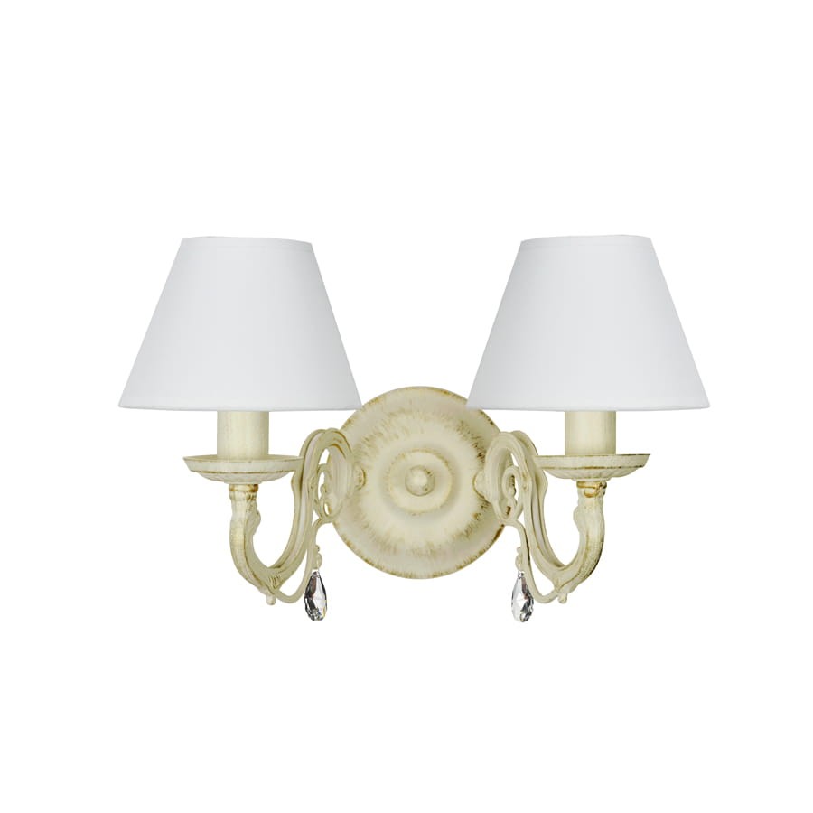 Postarzany podwójny kinkiet z kryształkami, wyjątkowo efektowny, świetnie pasujący do klasycznych aranżacji. Kryształowe zawieszki pięknie rozpraszają światło a abażury z tkaniny dodają lampie stylu. Uwagę zwraca ciekawa kolorystyka stelaża- delikatny odcień ecru ozdobiono złotymi przecierkami.