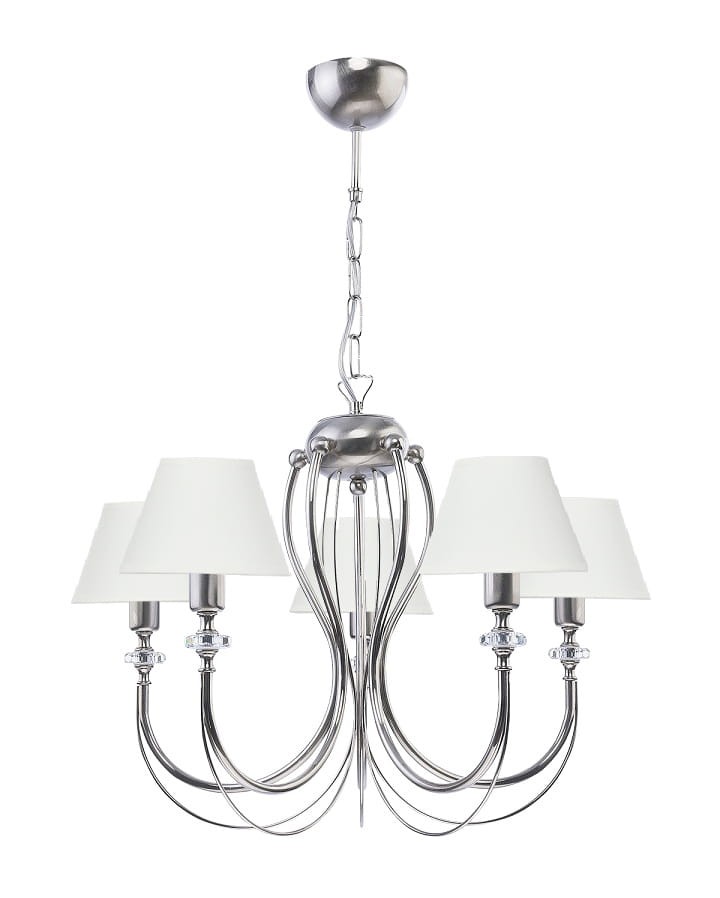 Wyjątkowo elegancki srebrny żyrandol z abażurami pasuje do klasycznie urządzonych wnętrz a także do aranżacji w stylu glamour. Kryształowe ozdoby umieszczone na ramionach żyrandola dodają lampie niesamowitego blasku.