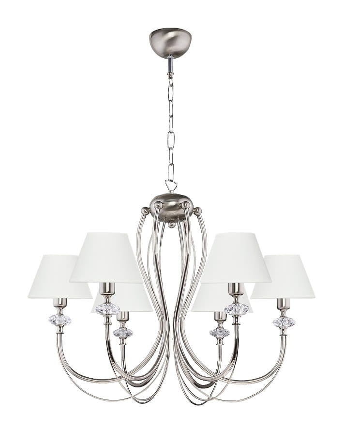 Srebrny żyrandol z kryształkami w cieszącym się popularnością klasycznym stylu. Bardzo efektowna lampa wisząca do salonu, z pięknymi abażurkami z tkaniny. Wyjątkowy model, piękny i starannie wykonany przez polskiego producenta, kryształowe akcenty przyciągają wzrok i dodają lampie blasku.