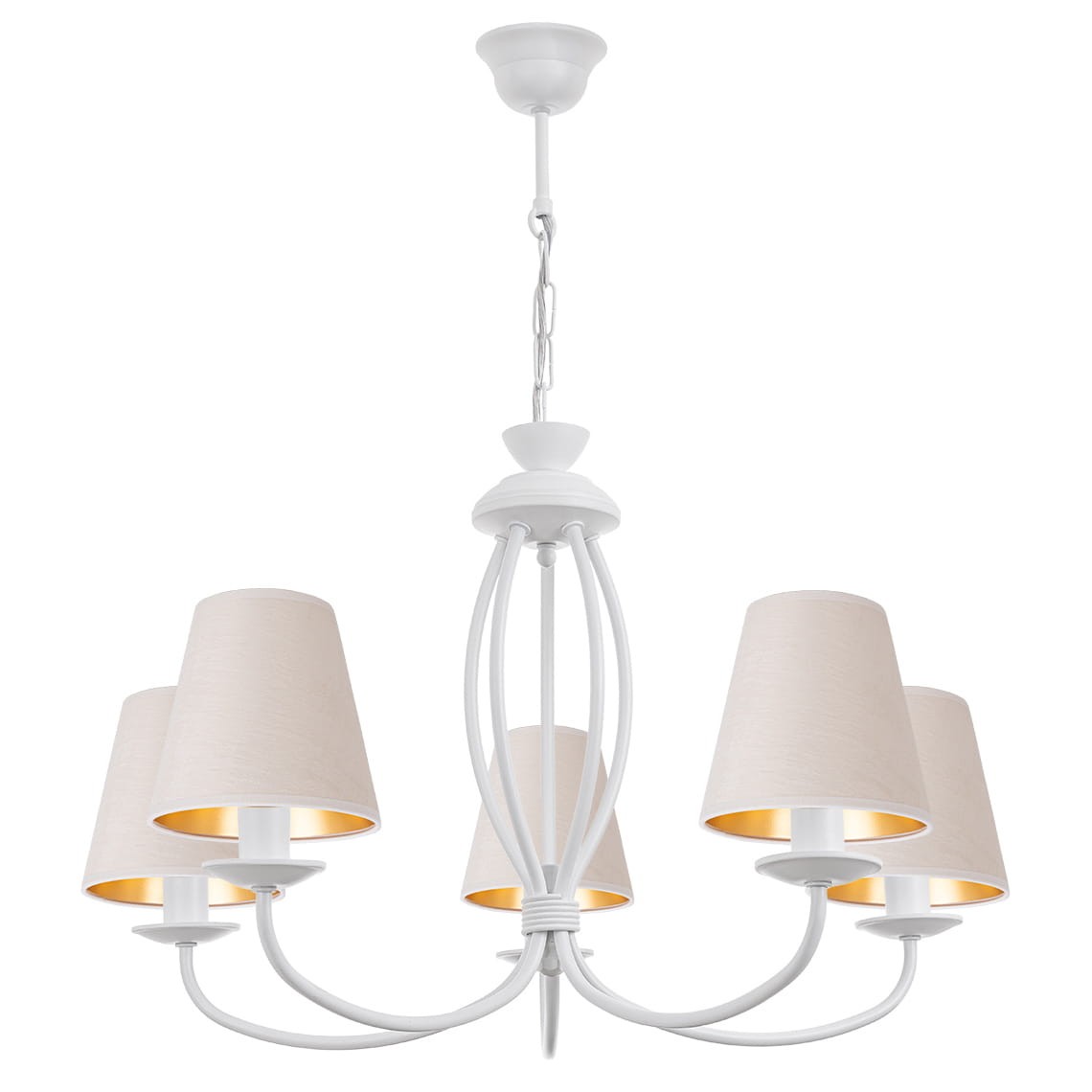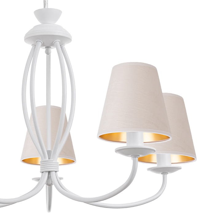 Stalowy biały żyrandol z welurowymi abażurkami OLIVER. Żyrandol ten to klasyczna lampa sufitowa z białym stelażem i pięcioma ramionami, zakończonymi abażurami z weluru o surowym, białym kolorze. Jasne kolory i miękki materiał nadają jej elegancki i przytulny wygląd. Taki model dobrze sprawdzi się w różnych pomieszczeniach, szczególnie w sypialni, salonie lub jadalni, wprowadzając do wnętrza lekkość i ciepło.
