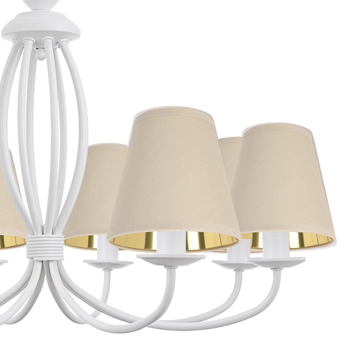 Stalowy żyrandol beżowo-biały OLIVER to elegancka, ośmioramienna lampa sufitowa z białym stelażem i abażurami w jasnobeżowym kolorze. Ich złote wnętrze nadaje światłu ciepły, nastrojowy charakter. Połączenie beżu i bieli tworzy delikatny i klasyczny wygląd, który dobrze wpasuje się w jasne, przestronne wnętrza. To doskonały wybór nad stół w jadalni lub do dużego salonu, gdzie liczy się przytulna elegancja.