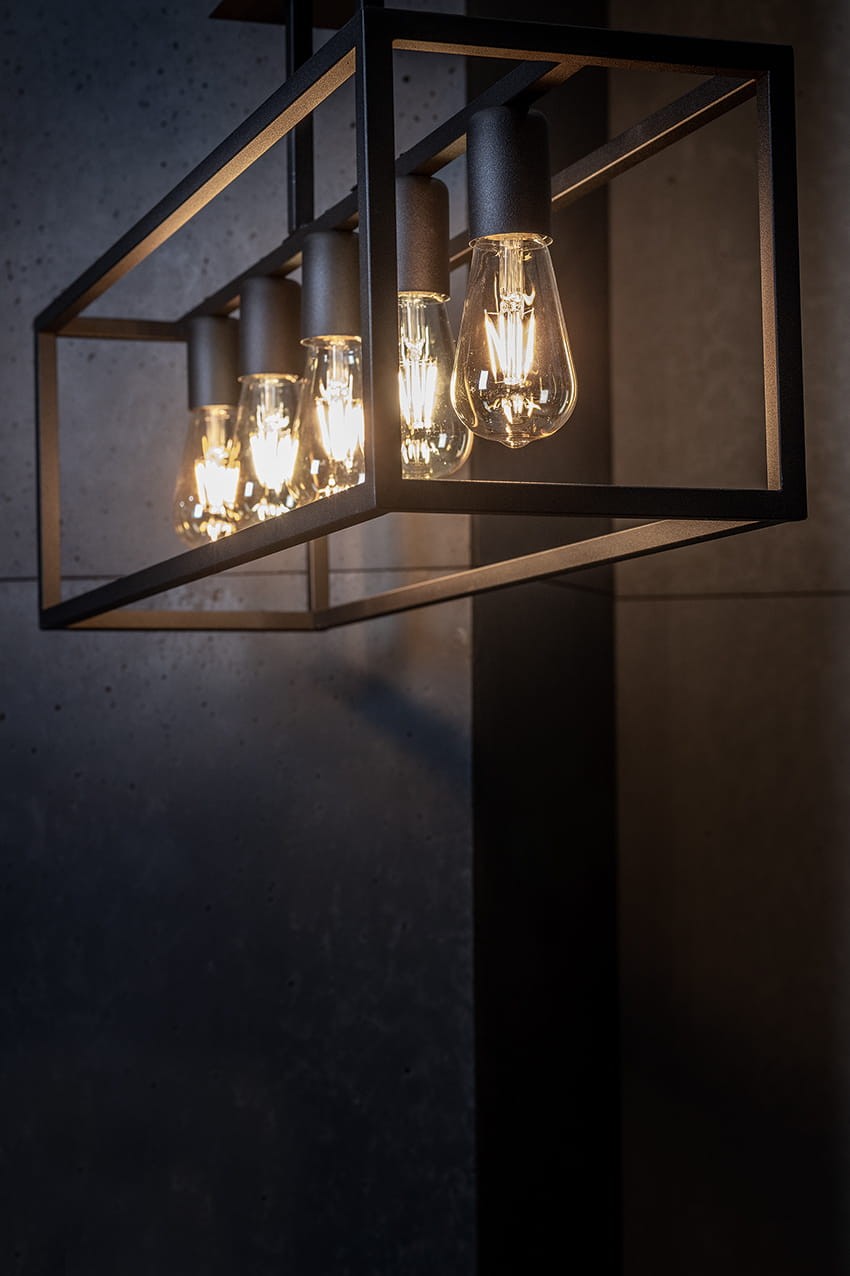 Stylowa lampa sufitowa do salonu, wyjątkowo oryginalna i bardzo "na czasie". Lampy przypominające metalowe klatki, o prostym, nieco surowym wzornictwie to obecnie jeden z najpopularniejszych trendów. Lampy są szczególnie polecane do używania z ozdobnymi żarówkami retro i doskonale je eksponują, dając dużo światła.