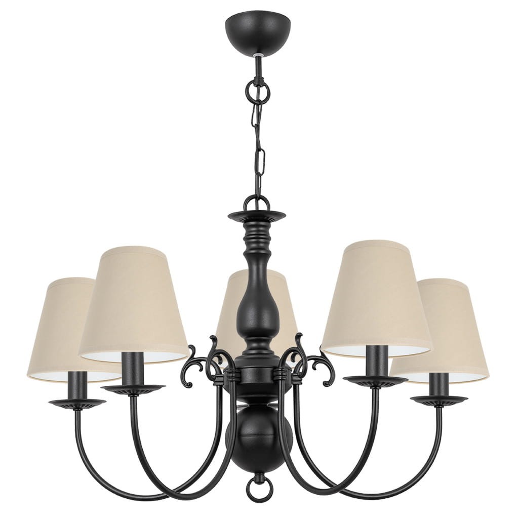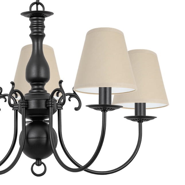 Czarny stalowy żyrandol do sypialni MARIA CZARNA z pięcioma ramionami w czarnym kolorze to elegancka lampa sufitowa. Beżowe abażury ocieplają całość, wprowadzając lekkość i sprawiając, że światło staje się miękkie oraz przyjemne dla oczu. Pięć punktów światła zapewnia odpowiednie doświetlenie nawet do większych pomieszczeń, dzięki czemu żyrandol świetnie sprawdzi się w salonie, jadalni czy przestronnym korytarzu.