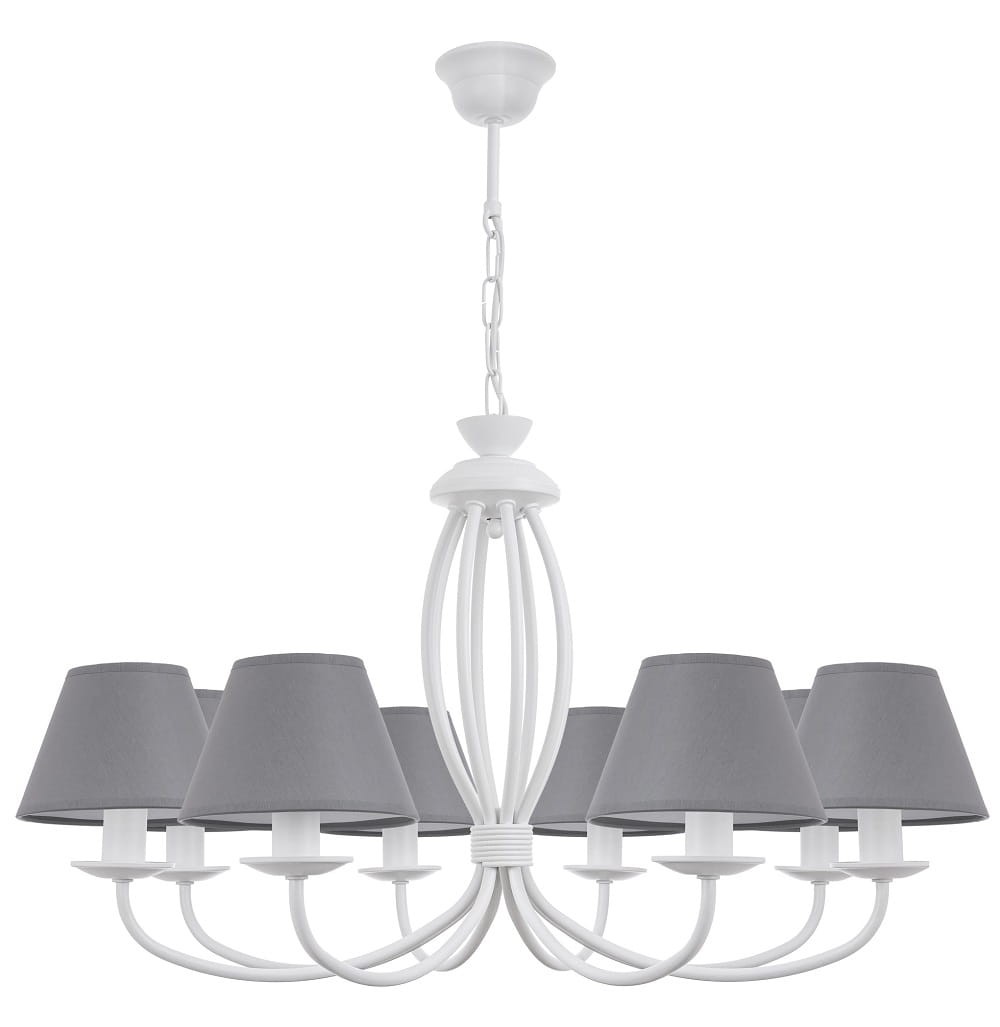 Stylowy biały żyrandol OLIVER 8-płomienny z szarymi abażurami, to modny dodatek do białych wnętrz. Ze względu na uniwersalność bieli można go łączyć z dowolnymi kolorami. Aby jeszcze piękniej wkomponować lampę do wnętrza można bezpłatnie zmienić kolor abażurów.