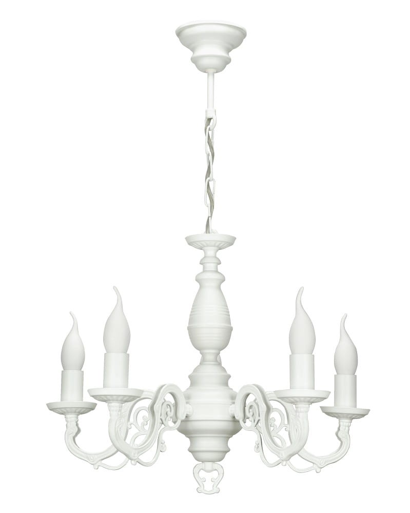 Stylowy biały żyrandol do salonu. Pełen wdzięku i bardzo dekoracyjny żyrandol do niewielkiego salonu lub sypialni. Ta piękna lampa zwraca uwagę ciekawym wzornictwem- efektowna tralka w centralnej części lampy została połączona z subtelnymi, ozdobnymi ramionami, tworząc harmonijną i pełną lekkości całość.