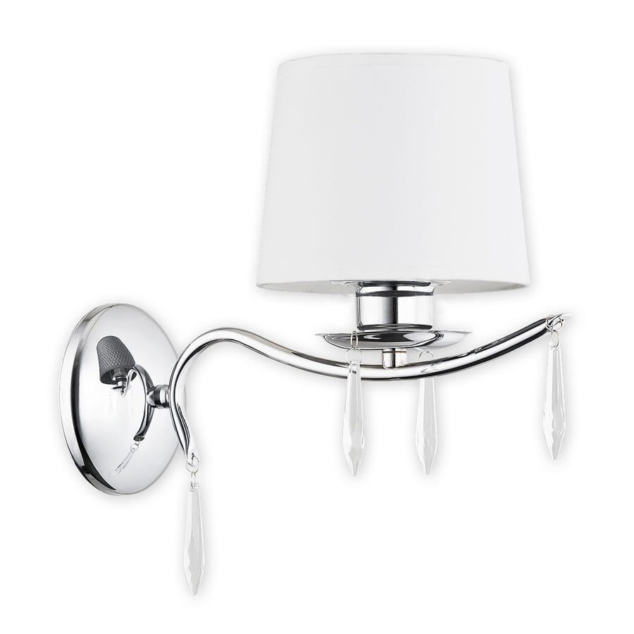 Stylowy kinkiet z kryształami- bardzo efektowny kinkiet w stylu glamour, z białym abażurem. Ta elegancka lampa będzie świetnym dodatkiem do sypialni. Światło kinkietu szczególnie sprawdza się w zimowe wieczory- jest bardziej nastrojowe niż to z sufitowego żyrandola. Lampa polskiej produkcji, wysoka jakość.